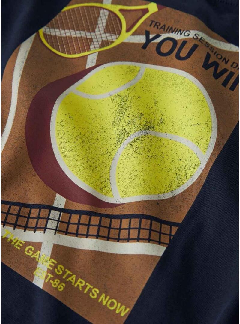 Maglietta Name It. Colore blu scuro. Collo rotondo. Manica lunga. Stampa frontale e posteriore. Design con motivo tennis. Testo You Win. Taglio dritto. Stile casual.