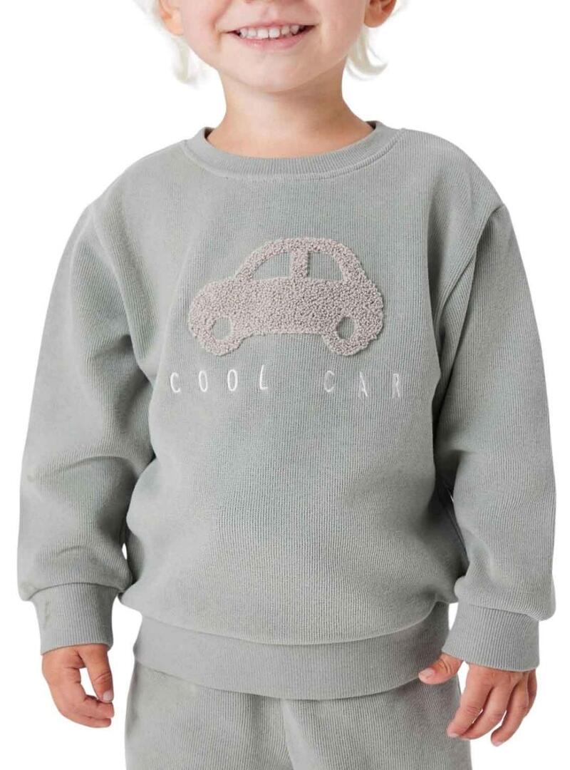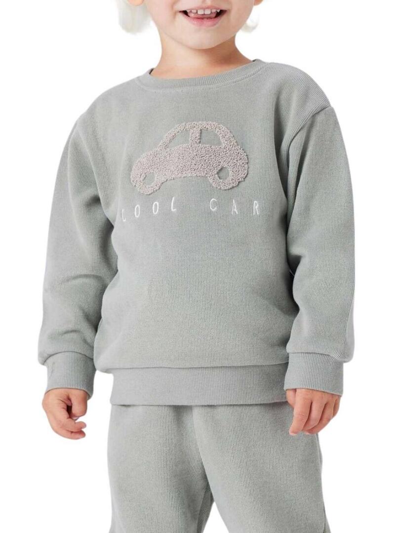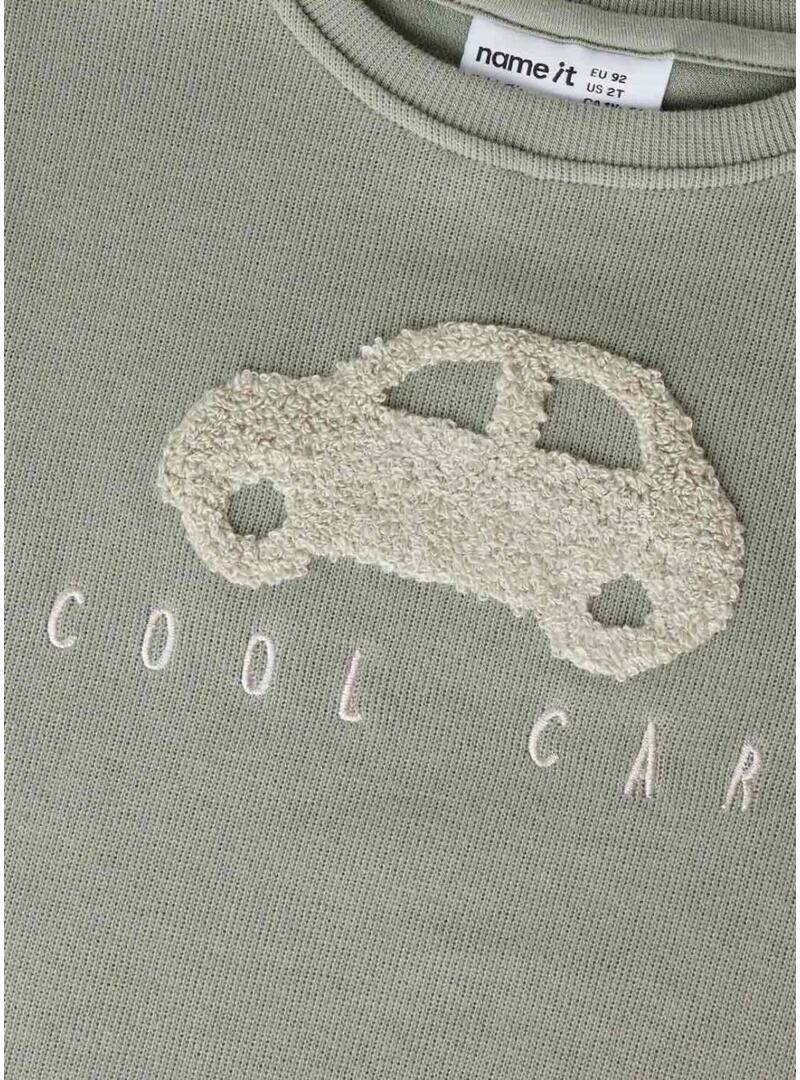 Felpa Name It. Colore verde grigio. Girocollo. Manica lunga. Disegno di macchina in rilievo. Testo Cool Car sul davanti. Polsini a costine. Fondo a costine. Taglio dritto.