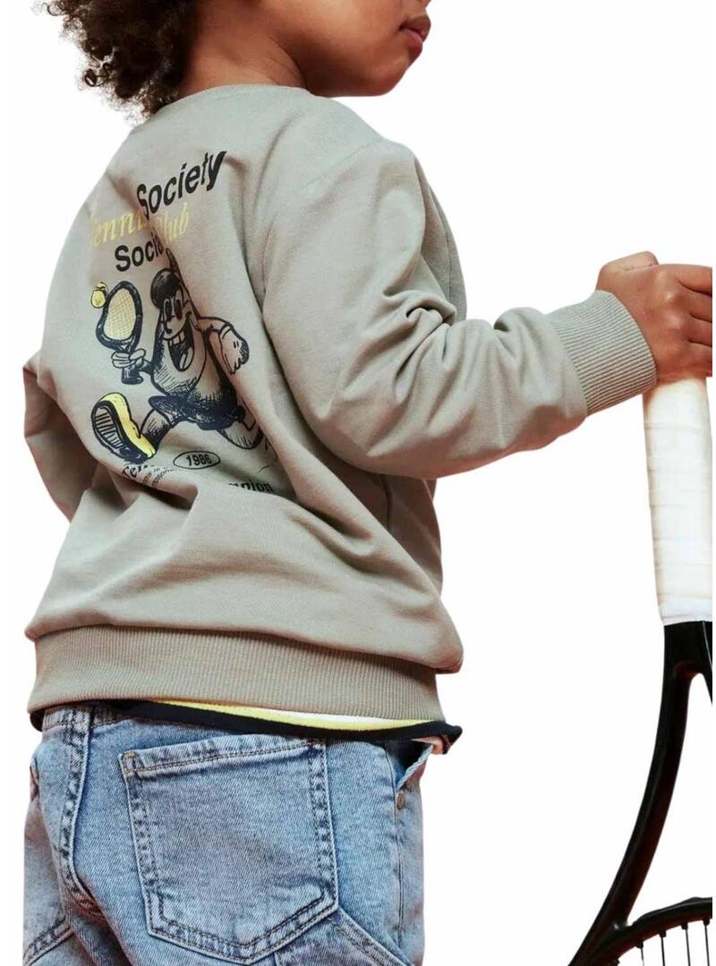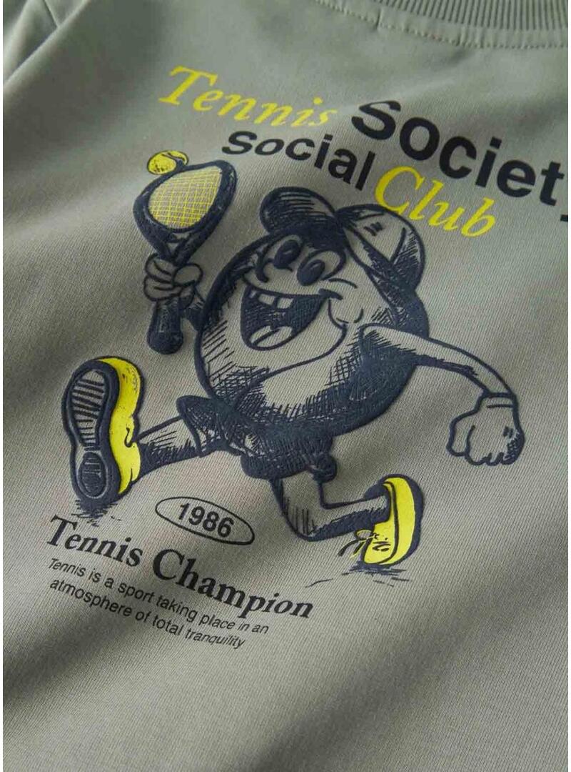 Felpa Name It. Colore verde grigio. Collo rotondo. Manica lunga. Testo Tennis Society Social Club sul petto. Grande stampa sulla schiena con disegno di un tennista. Finiture elastiche. Taglio comodo. Stile casual. Un capo pratico e originale.
