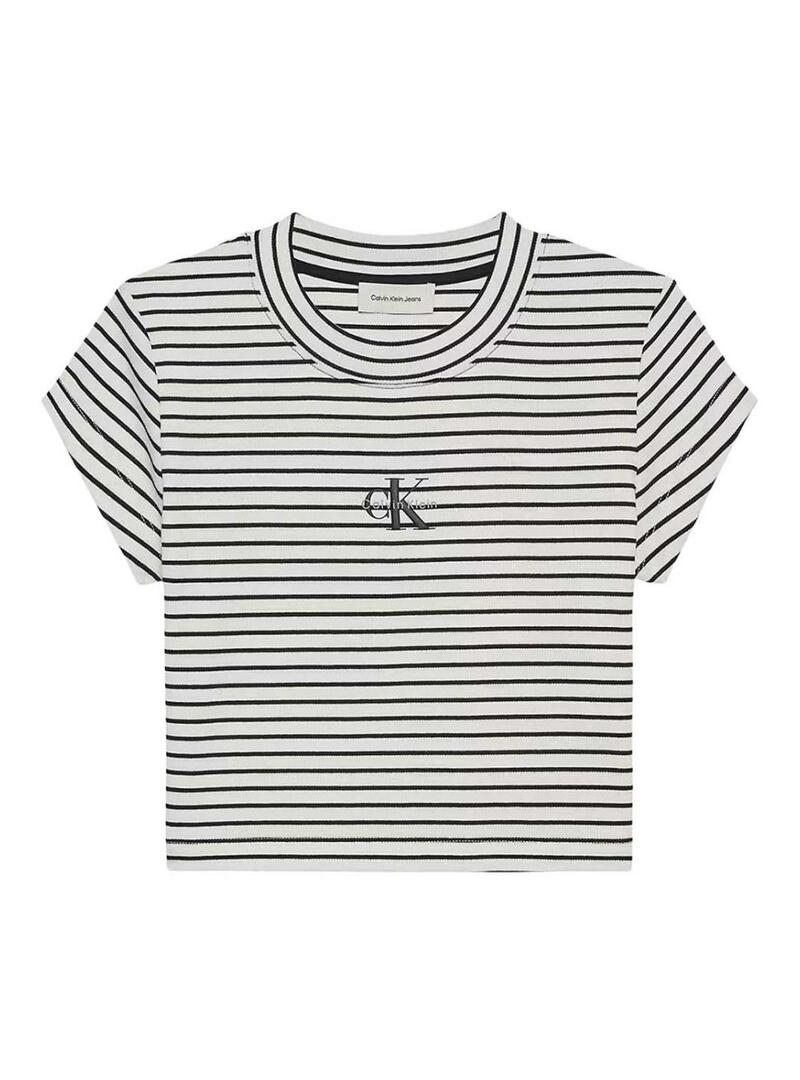 Maglietta Calvin Klein Jeans. Modello a righe. Colore bianco e nero. Righe orizzontali. Logo ricamato sul petto. Collo rotondo. Manica corta. Taglio aderente. Lunghezza cropped. Tessuto a coste.