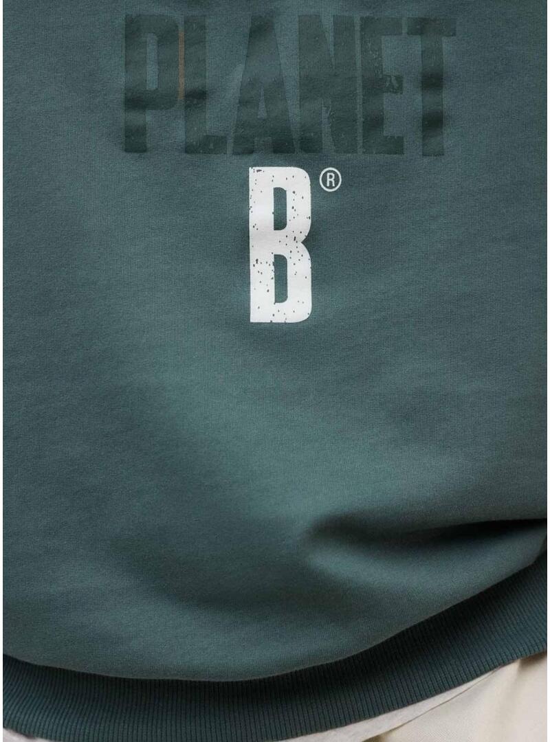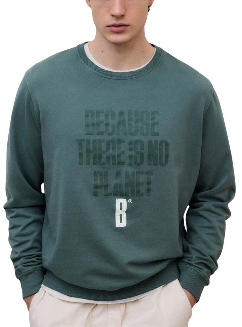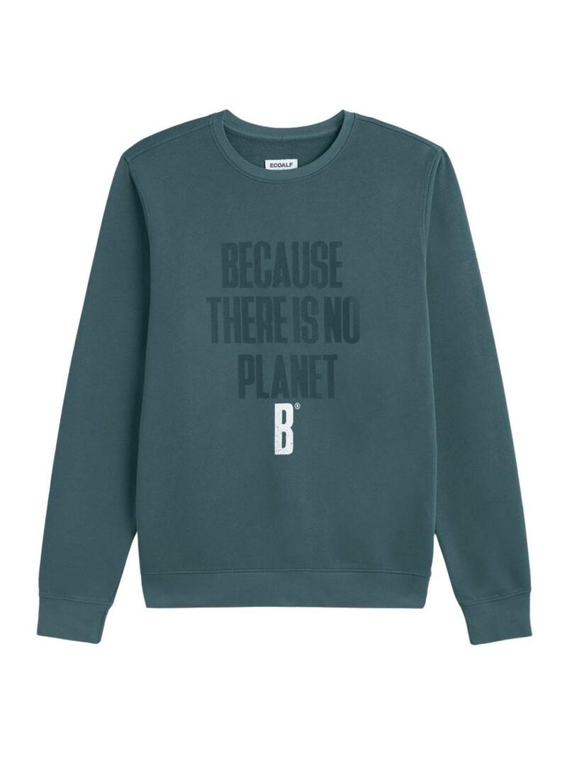 Felpa Ecoalf. Modello Bardera. Colore verde. Girocollo. Manica lunga. Realizzata con cotone riciclato. Taglio regolare. Stampa Because There is no planet b sulla parte anteriore. Finiture a costine. Tinta e lavata in capo. Il modello indossa la taglia L.