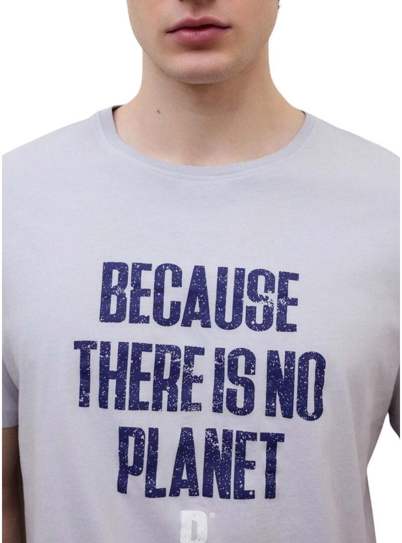 Maglietta Ecoalf. Modello Min. Colore grigio. Realizzata con cotone riciclato. Collo rotondo. Manica corta. Vestibilità regolare. Stampa Because There is no planet B sulla parte anteriore con effetto consumato. Il modello indossa la taglia L.