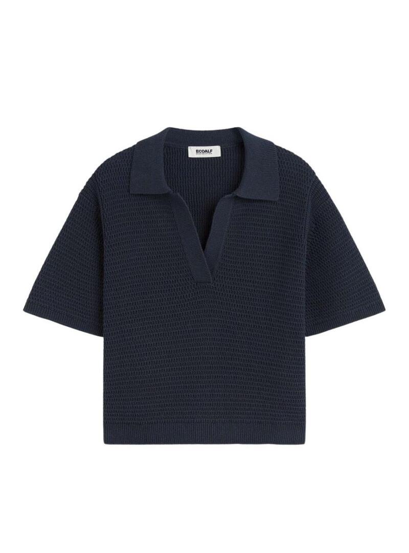 Maglia Ecoalf. Modello Anna. Colore navy. Vestibilità rilassata. Colletto polo a V. Spalle cadenti. Manica corta. Orli a costine. Il modello indossa la taglia S.