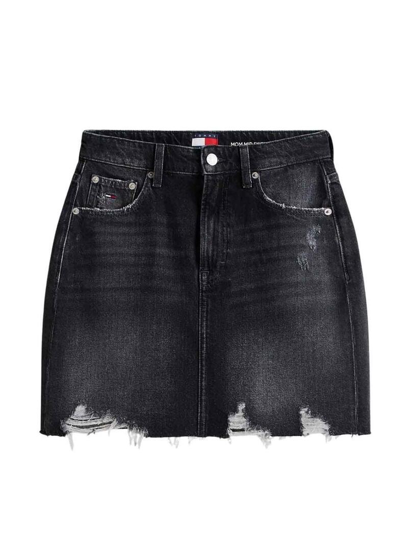 Gonna corta Tommy Jeans. Modello Mom. Colore nero. Tessuto denim rigido. Effetto usurato e sbiadito. Chiusura con zip e bottone. Cinque tasche. Dettagli distintivi di Tommy Jeans. Taglio dritto. Vita alta.
