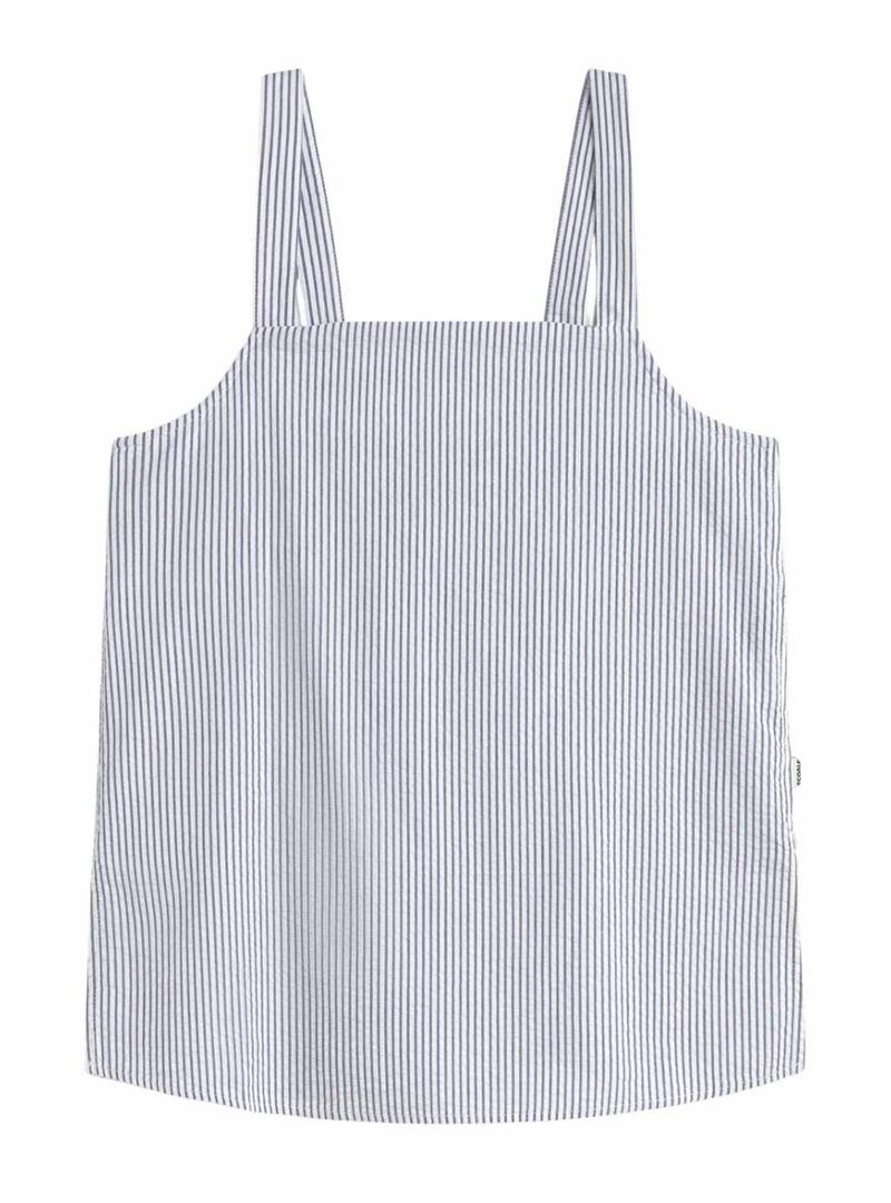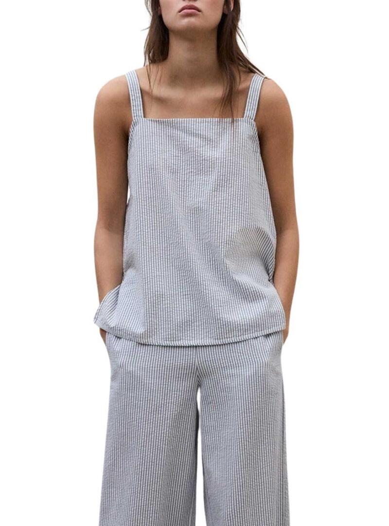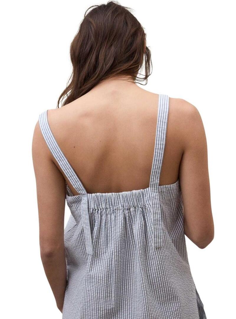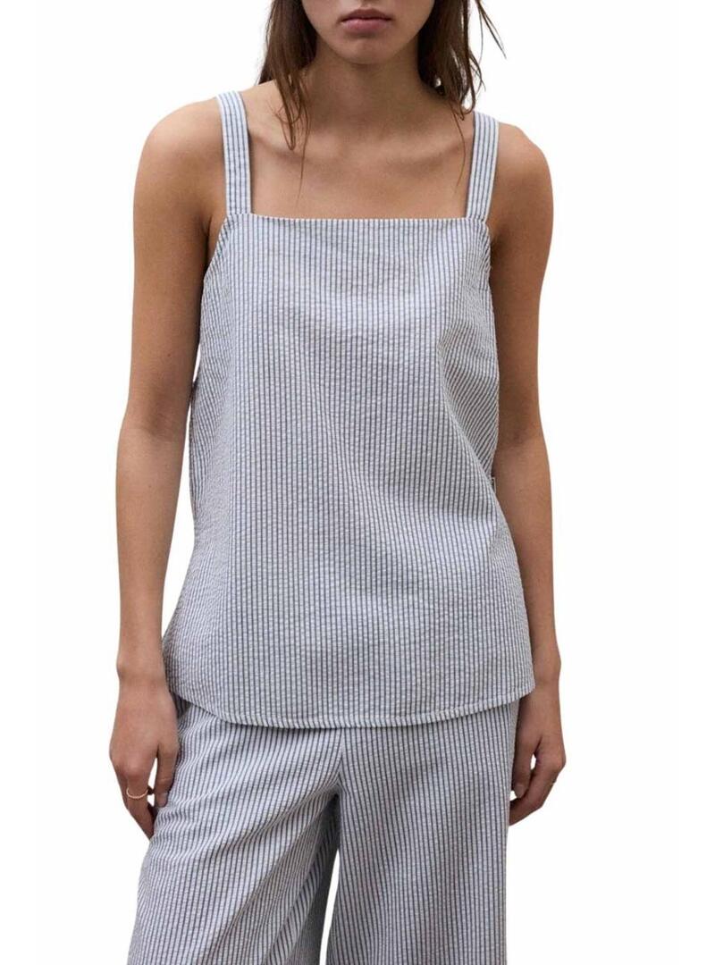 Top Ecoalf. Modello Aria. Stampato a righe blu e bianche. Con spalline. Vestibilità regolare. Scollo quadrato. Fascia elastica sul retro. Aperture laterali. La modella indossa la taglia S.
