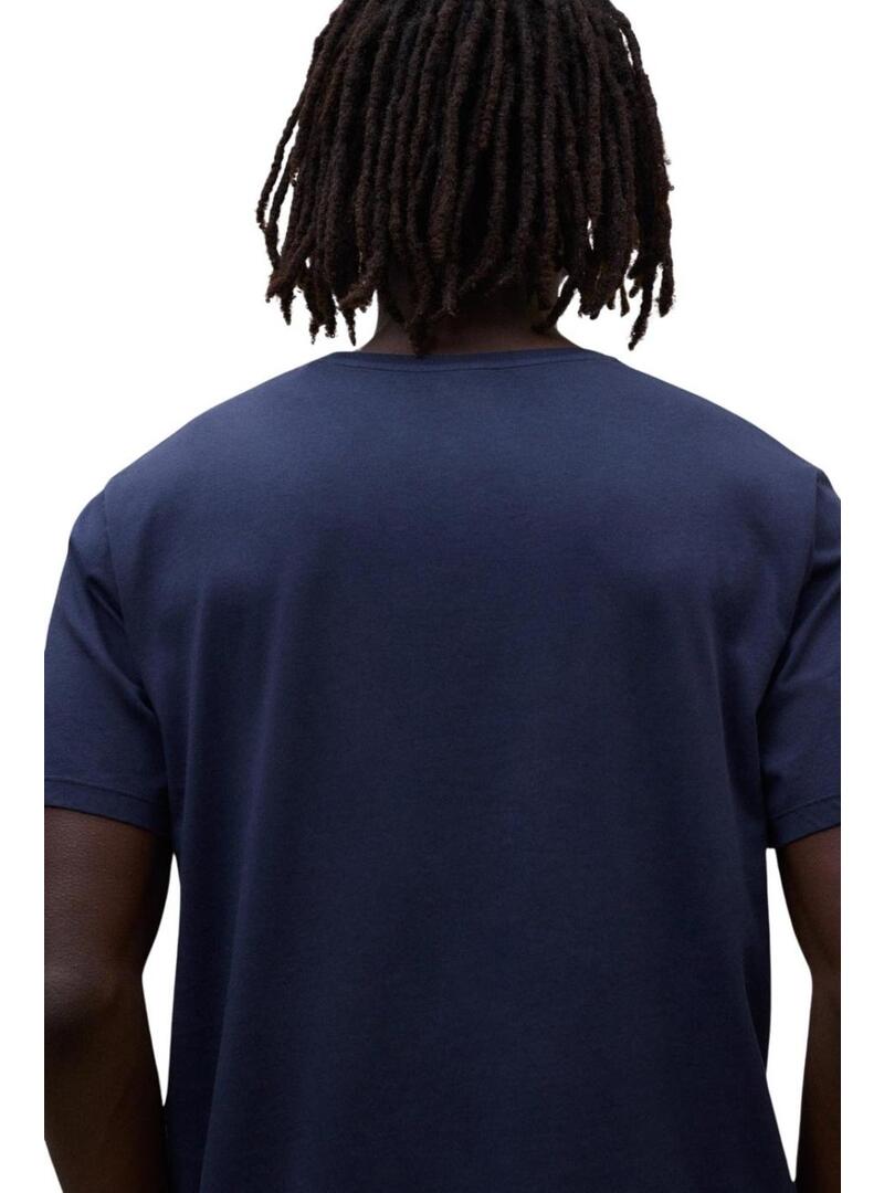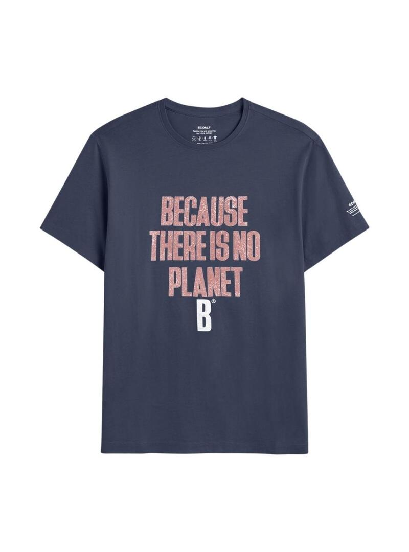 Maglietta Ecoalf. Modello Min. Colore navy. Collo tondo. Manica corta. Taglio regolare. Stampa del marchio: Because There is no planet B sulla parte anteriore con effetto consumato.