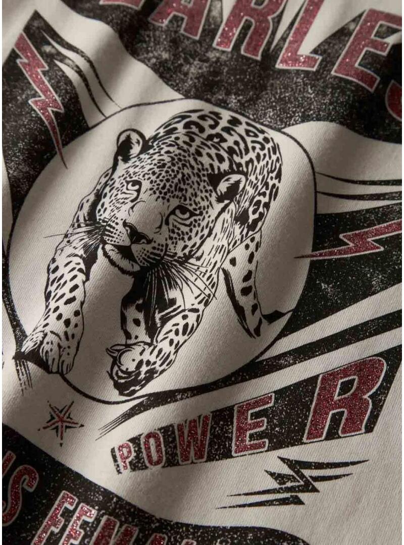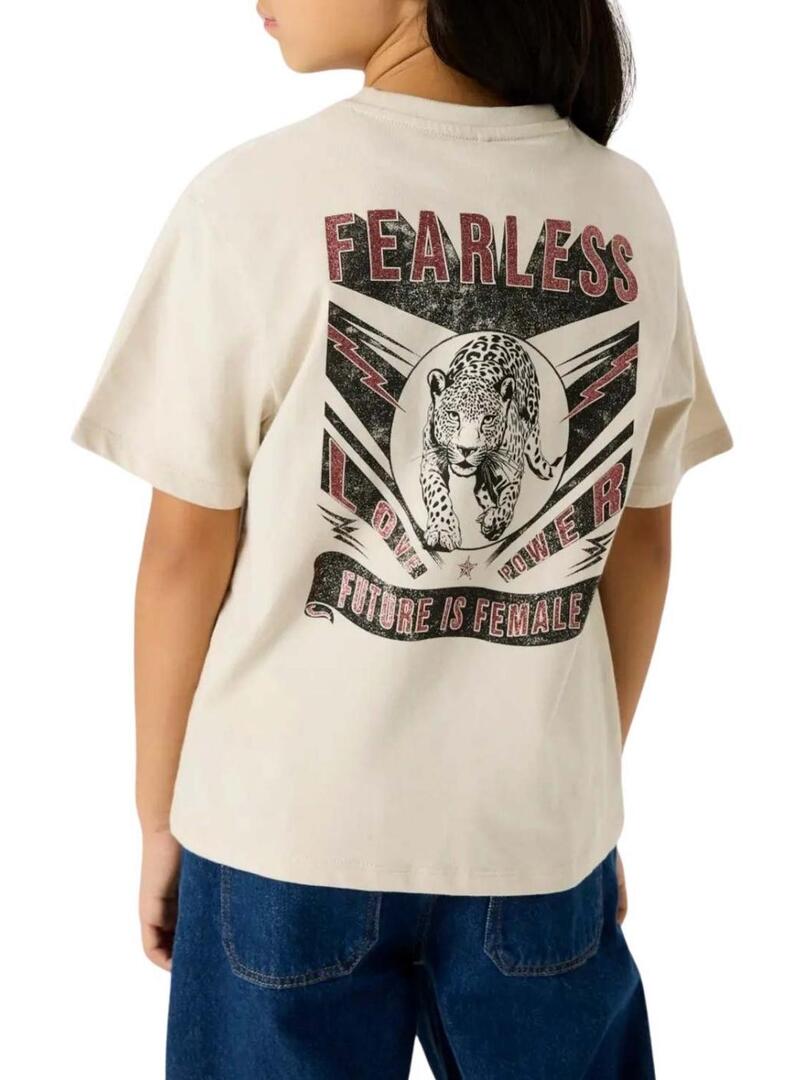 Maglietta Name It. Colore beige chiaro. Collo rotondo. Manica corta. Stampa frontale con scritta Fearless. Grande design posteriore con leopardo e messaggio decorativo. Taglio dritto. Stile casual.