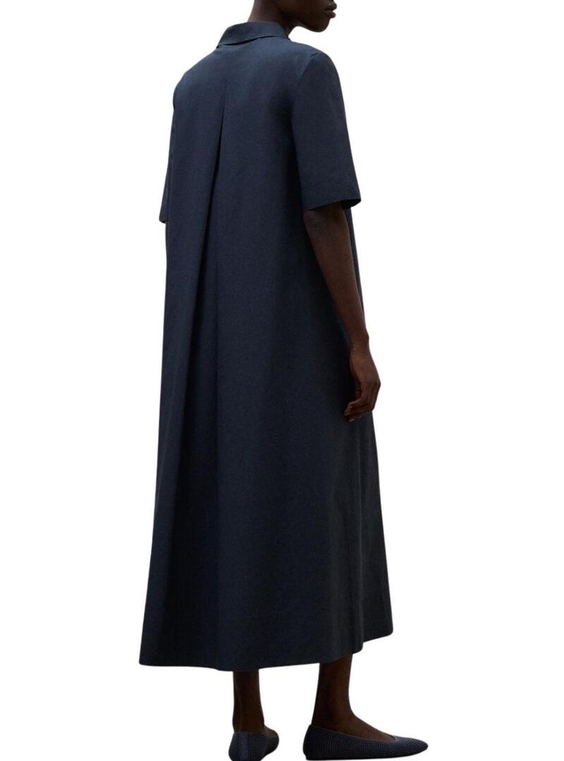 Abito Ecoalf. Modello Martina. Colore navy. Realizzato con TENCEL. Vestibilità ampia. Patta anteriore con bottoni nascosti. Tasche sui lati. Colletto da camicia. Mezza manica. Lunghezza midi. La modella indossa la taglia S.