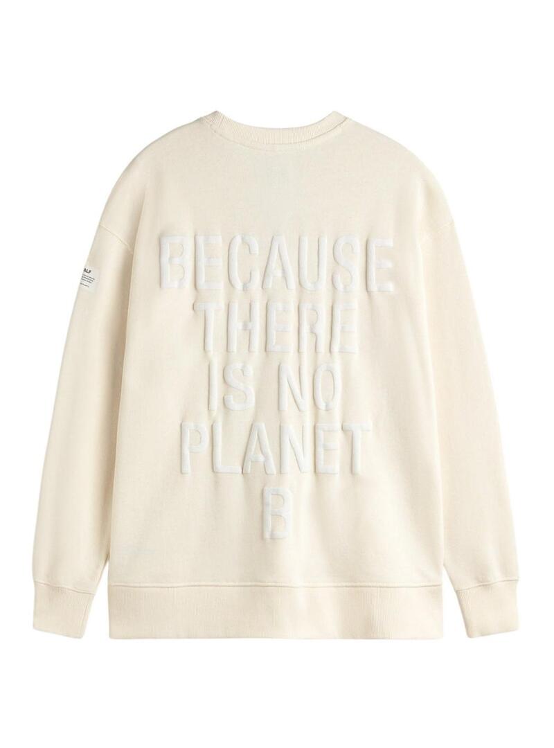 Felpa Ecoalf. Modello Storm. Colore beige. Realizzata con cotone riciclato e biologico. Taglio oversize. Collo rotondo. Spalle cadenti. Stampato Because There is not a Pantel B sul retro. Logo del marchio su una manica. Il modello indossa la taglia M.