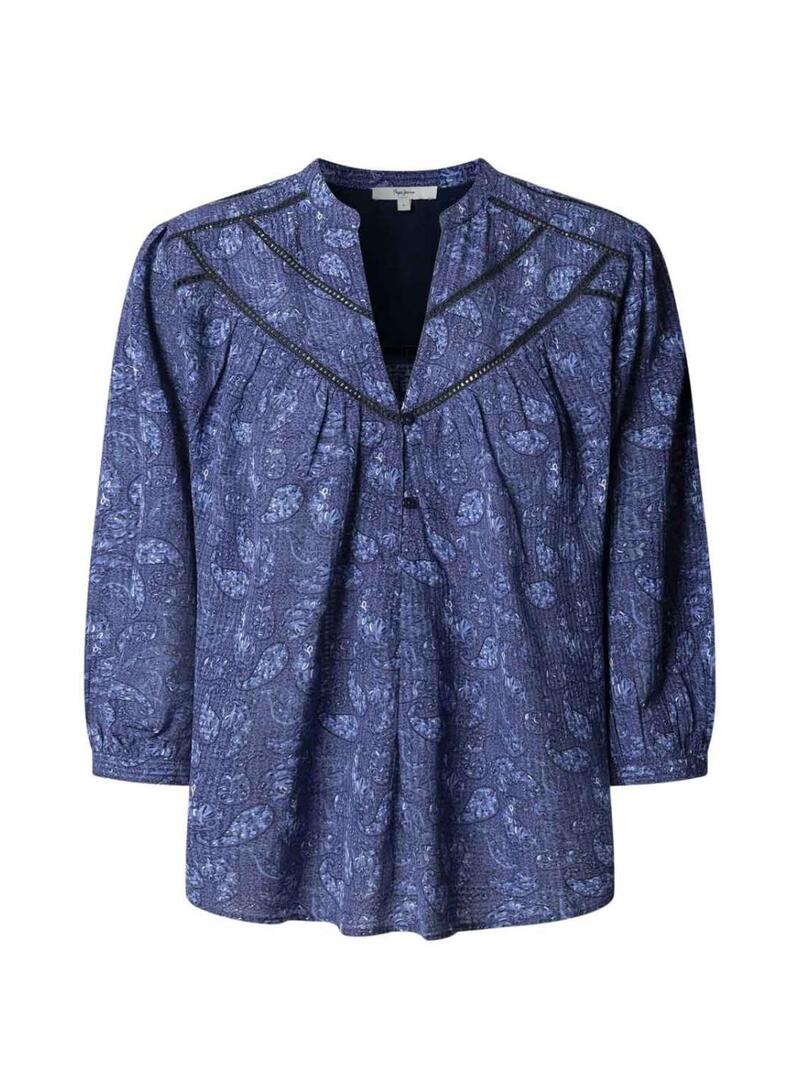 Camicia Pepe Jeans. Modello Brigitte. Colore blu. Scollo a V. Collo rotondo. Manica a tre quarti. Vestibilità ampia. Stampa etnica. Cuciture a sbalzo sul petto e sulla schiena.