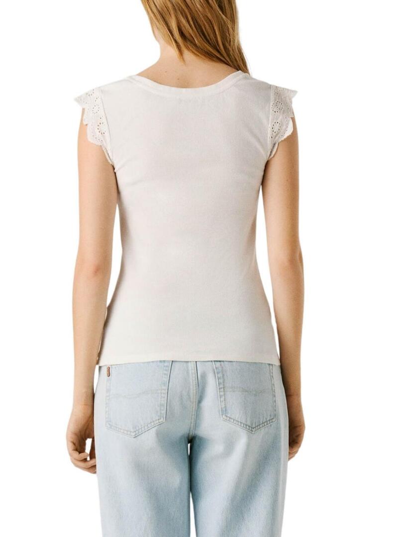 Maglietta Pepe Jeans. Modello Mireya. Colore bianco. Scollo rotondo. Manica extra corta con dettaglio ricamato. Corpo a coste. Taglio aderente.