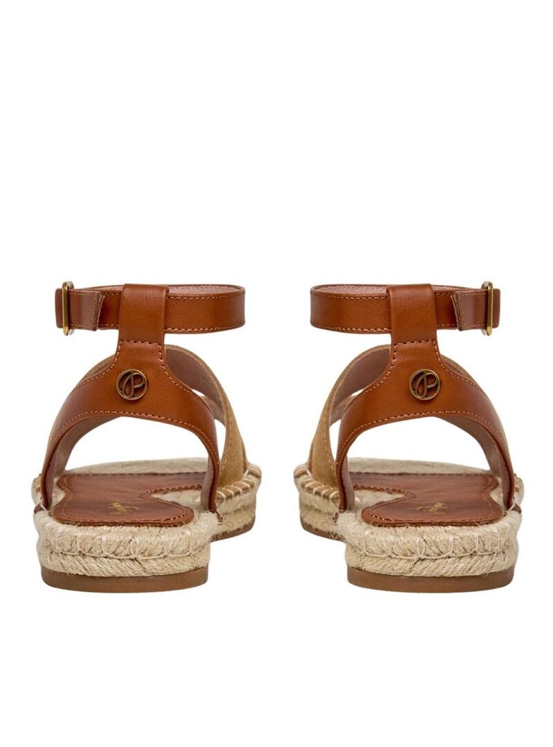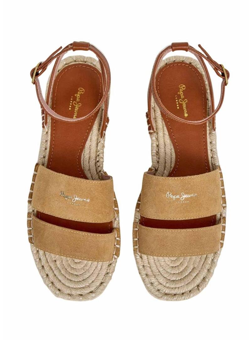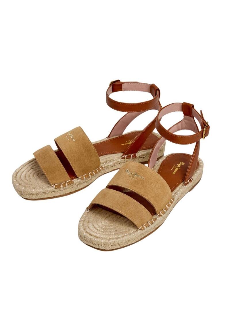 Sandali Pepe Jeans. Modello Auri. Colore cammello. Doppia fascia in camoscio sul collo del piede con logo. Chiusura con fibbia metallica alla caviglia. Soletta foderata con logo stampato. Suola piatta in gomma antiscivolo. Zeppa in iuta naturale.