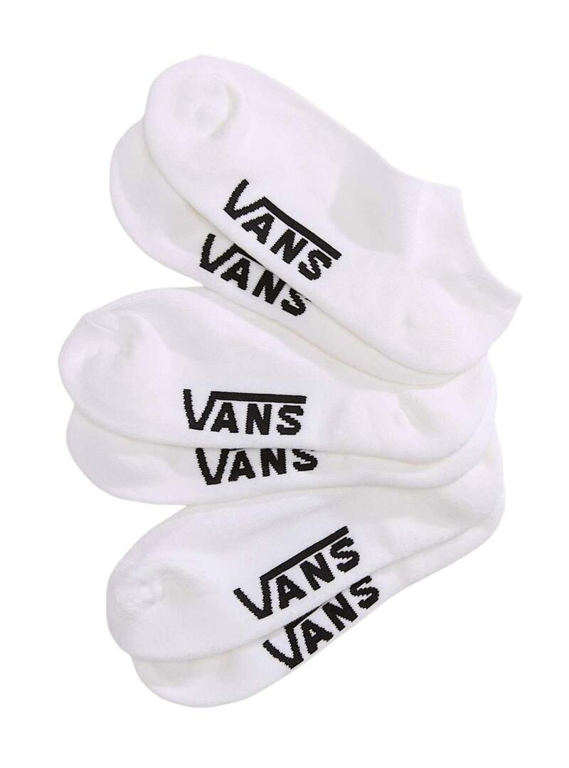 Calze Vans. Tre paia. Colore bianco. Modello Classic Kick. Formato invisibile. Suola imbottita. Logo Vans in colore nero. Tessuto a coste. Taglie: S: 35-38, M: 39-42, L: 43-46.