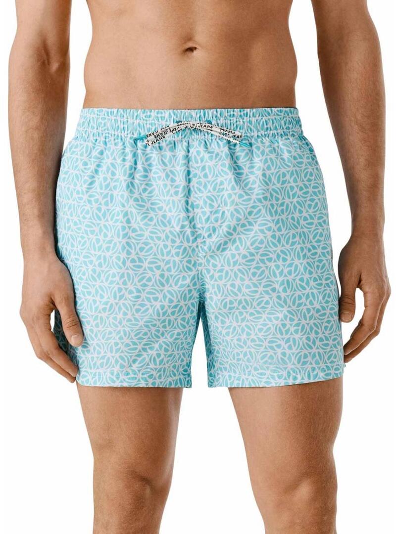 Costume da bagno Pepe Jeans. Modello Print. Colore blu turchese e bianco. Vita elasticizzata regolabile. Lacci con logo serigrafato. Tasche laterali. Vestibilità regolare. Tasca posteriore a toppa. Tessuto con stampa all over.