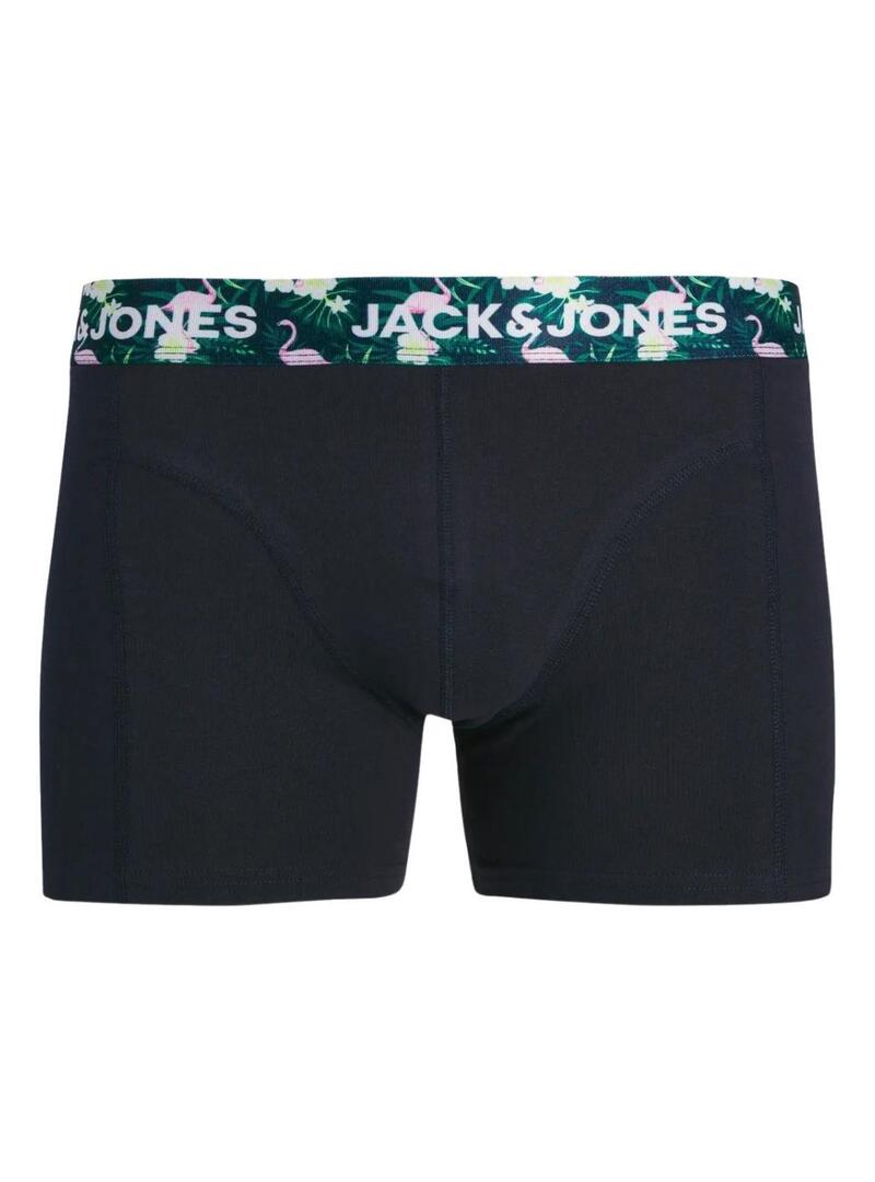 Pacco di slip Jack and Jones. Modello Fenicottero. Pacco da tre boxer. Vita elastica con marchio. Due con stampa floreale e fenicotteri. Uno nero a tinta unita con vita stampata.