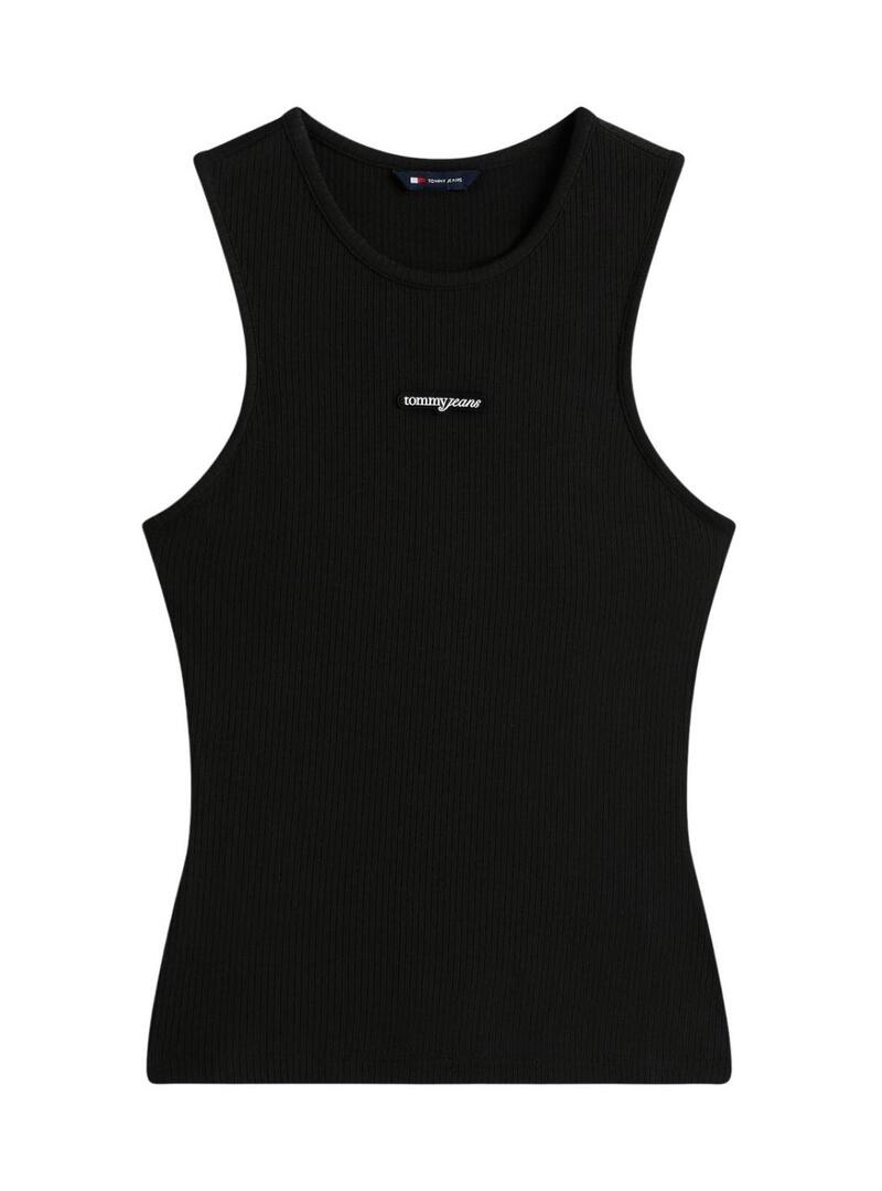 Top Tommy Jeans. Modello Script Label. Colore nero. Scollo rotondo. Senza maniche. Tessuto a costine. Logo ricamato sul petto. Taglio aderente.