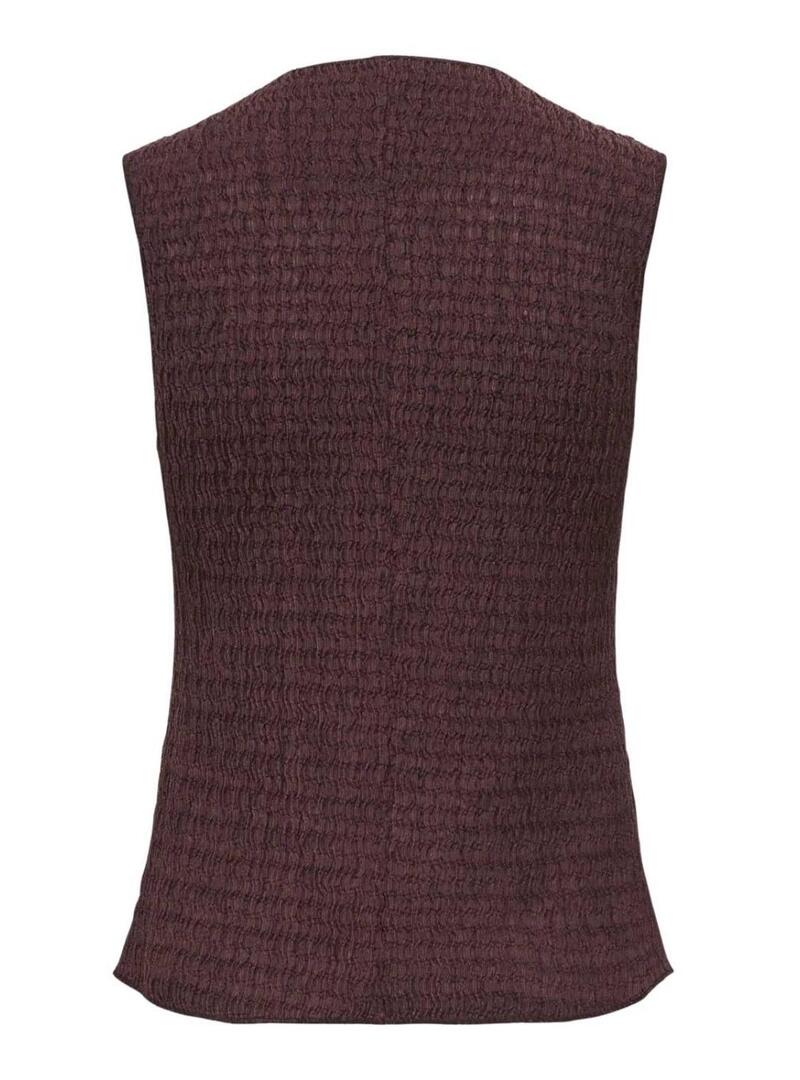Gilet Only. Modello Ilse. Colore marrone. Tessuto strutturato. Chiusura anteriore con bottoni. Senza maniche. Collo rotondo. Il modello indossa la taglia S.