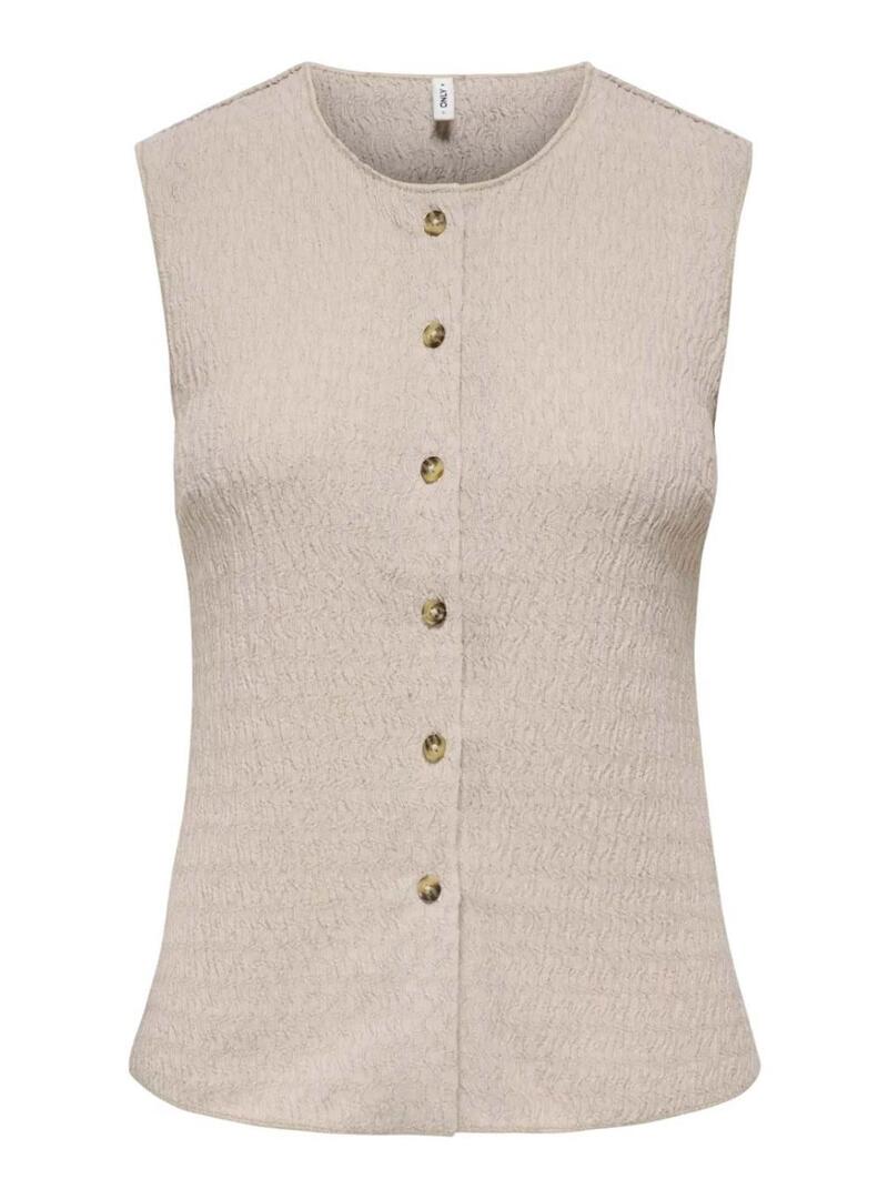Gilet Only. Modello Ilse. Colore beige. Tessuto strutturato. Chiusura frontale con bottoni. Senza maniche. Collo rotondo. Taglio regolare. La modella indossa la taglia S.