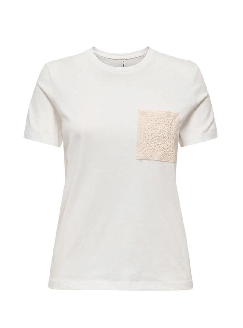 Maglietta Only. Modello Lenja. Colore nero. Collo rotondo. Manica corta. Vestibilità regolare. Tasca all'uncinetto sul petto in colore beige. Stile basico.