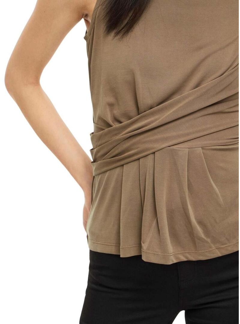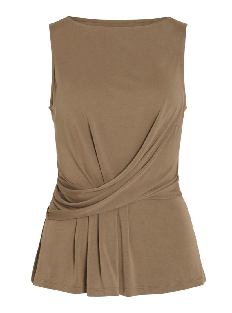 Top Vila. Modello Modala. Colore tostato. Collo rotondo. Senza maniche. Tessuto leggero ed elastico. Pieghe davanti. Leggermente aderente in vita.