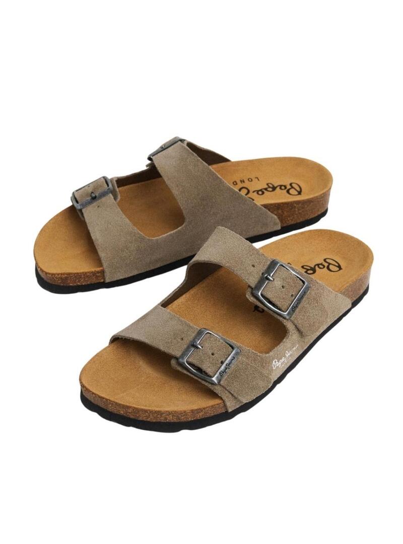 Sandali Pepe Jeans. Modello Oban. Colore beige. Doppia fascia con fibbie metalliche. Logo inciso sul lato. Soletta sagomata in sughero. Suola in gomma.