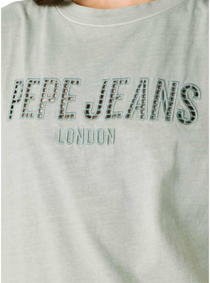 Maglietta Pepe Jeans. Modello Mirari. Colore verde. Collo rotondo. Senza maniche. Spalle con effetto spalline. Logo ricamato con trafori sul petto. Vestibilità diritta. Tessuto con effetto lavato.