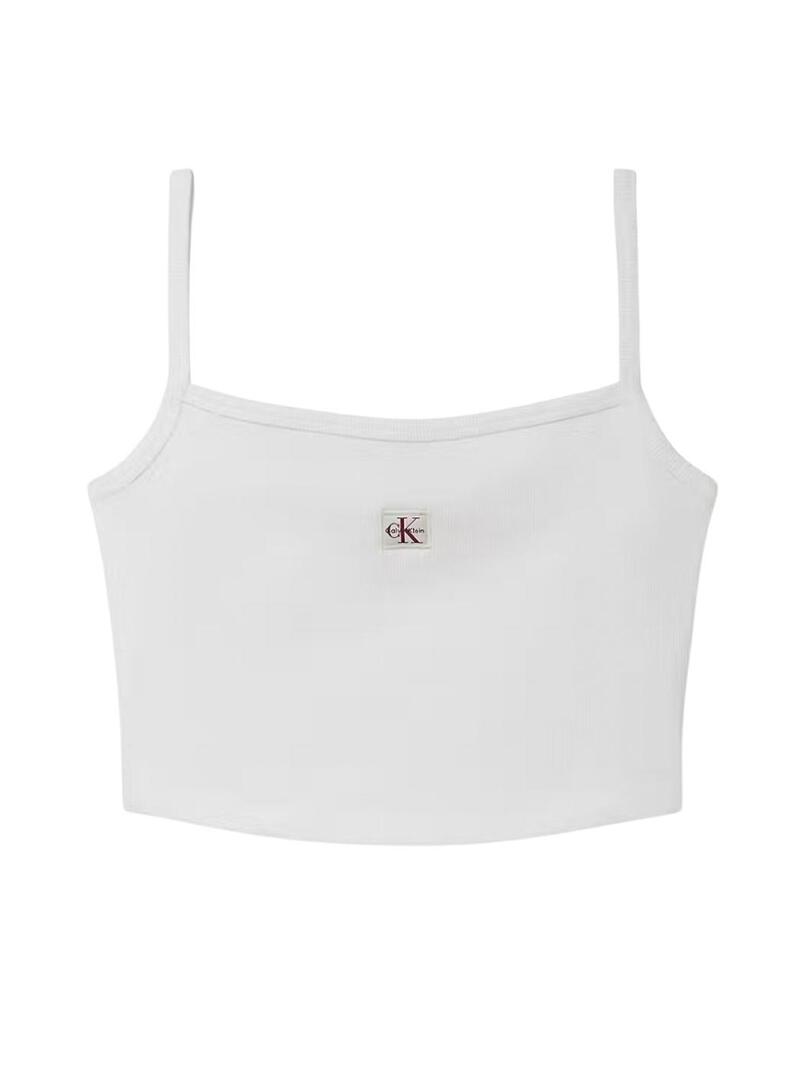 Top corto Calvin Klein Jeans. Modello Baby Crop. Colore bianco. Scollo quadrato. Spalline sottili. Etichetta del marchio ricamata sul petto. Lunghezza crop. Tessuto a coste. Taglio aderente.