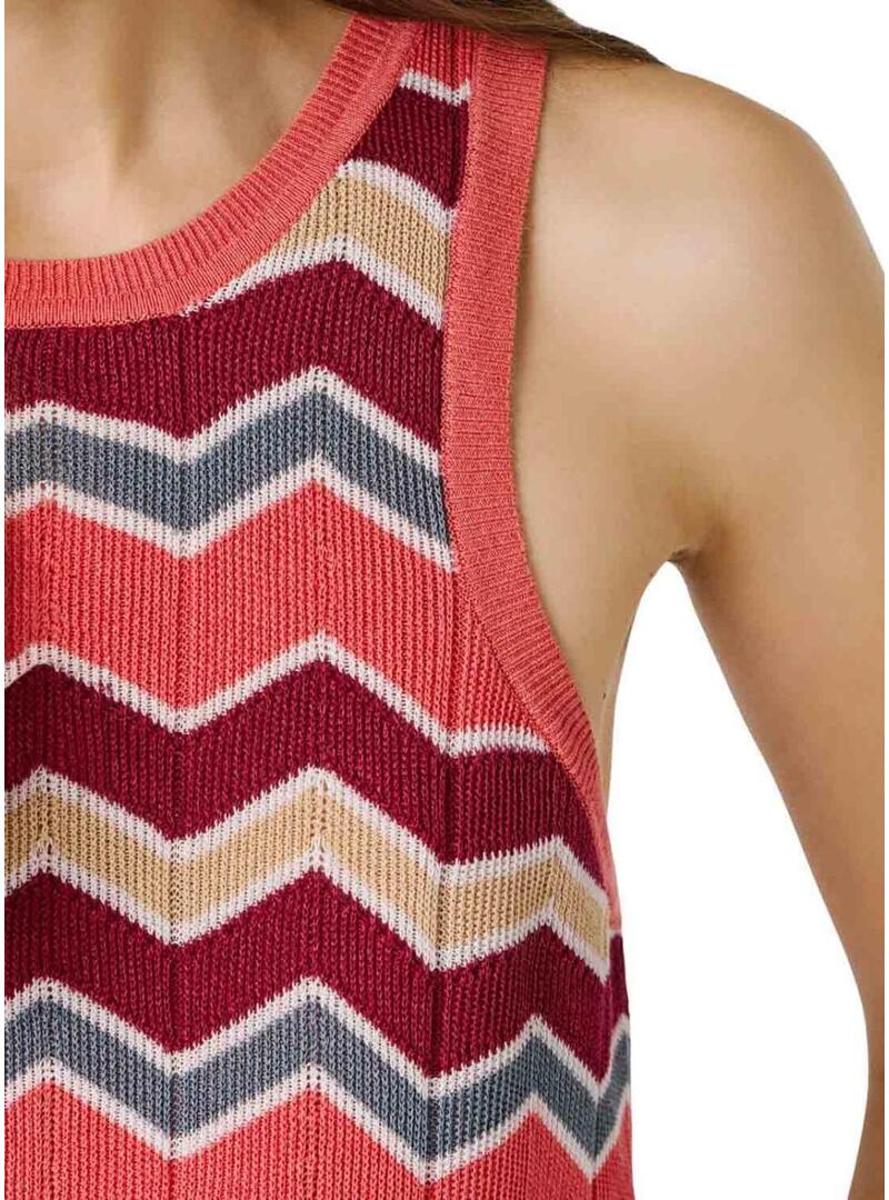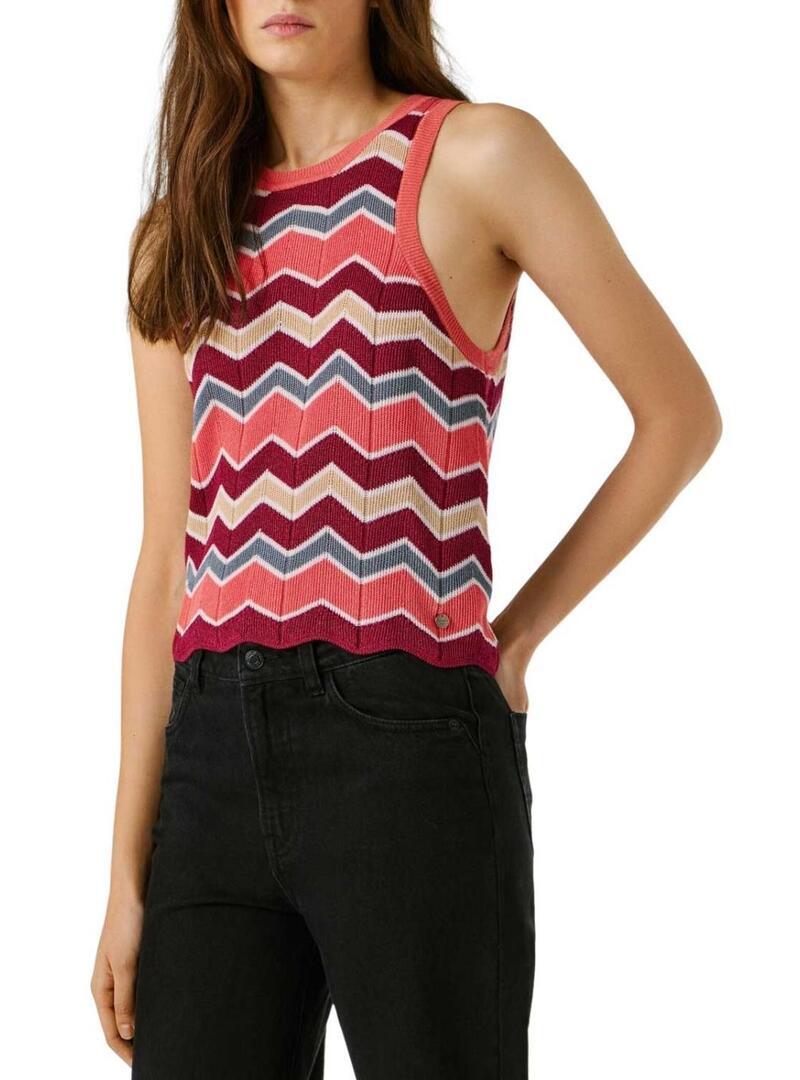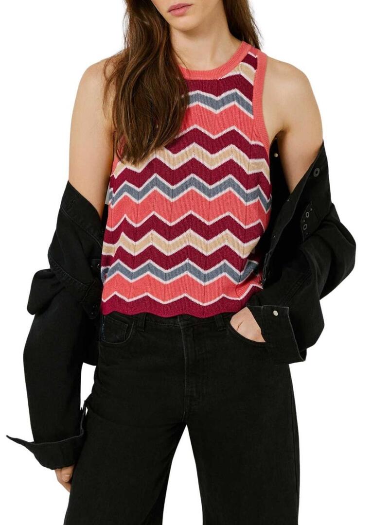 Top Pepe Jeans. Modello Kasha. Multicolore. Tonalità rosa. Girocollo. Senza maniche. Tessuto a coste. Stampa geometrica a zig zag. Vestibilità regolare. Logo metallico sul fondo.