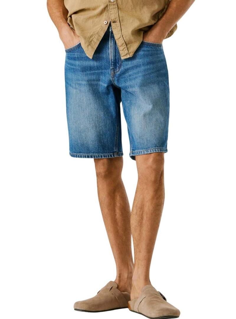 Bermuda Pepe Jeans. Modello Camden. Colore blu. Denim medio. Effetto lavato. Vestibilità affusolata. Cinque tasche. Chiusura con bottone e zip. Patch del marchio in vita.