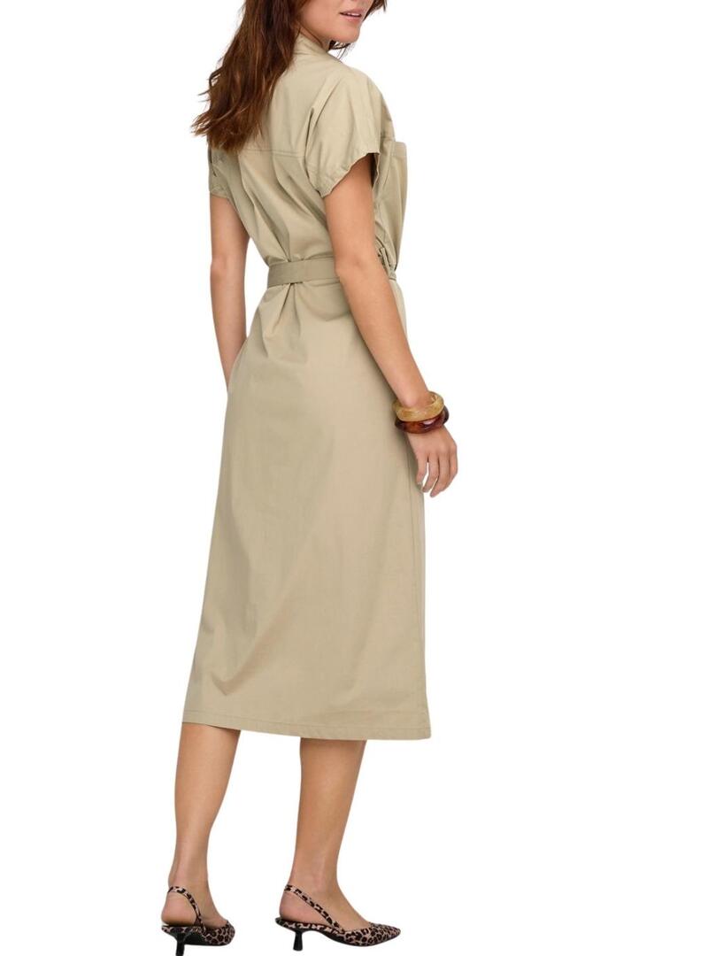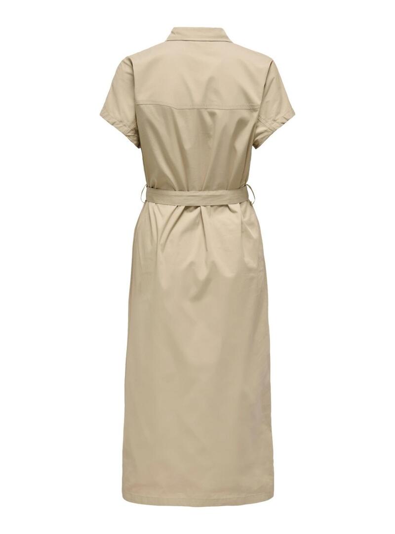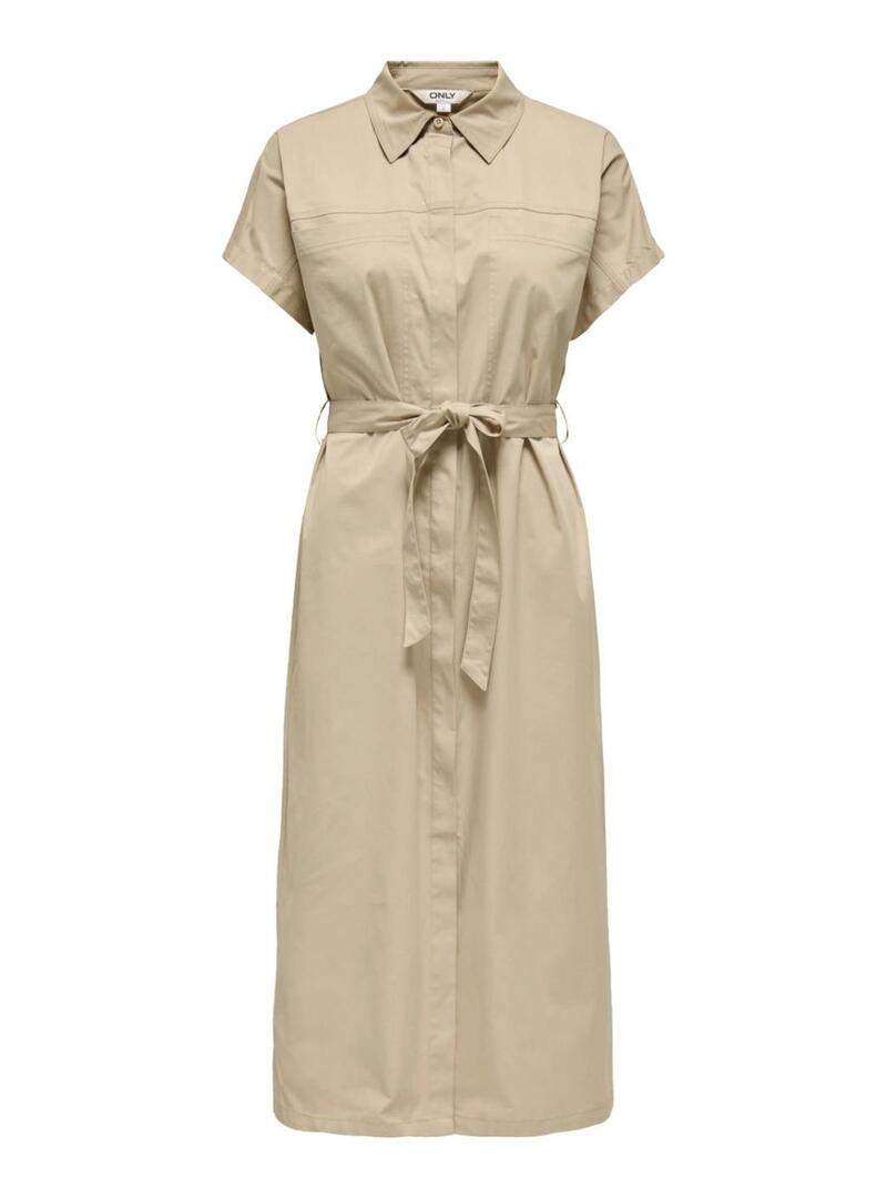 Abito Only. Modello Tanny. Colore beige. Stile utilitario. Manica corta. Chiusura con bottoni nascosti. Lunghezza midi. Cintura da annodare abbinata. Tasche applicate sul petto. Apertura frontale.