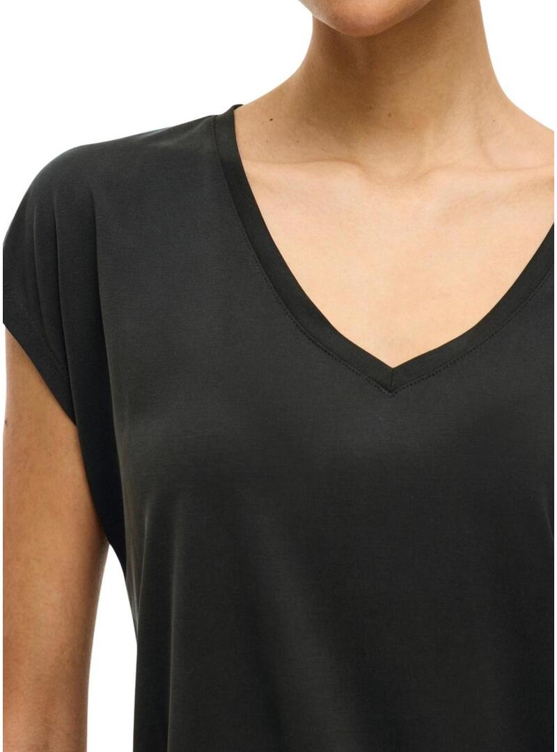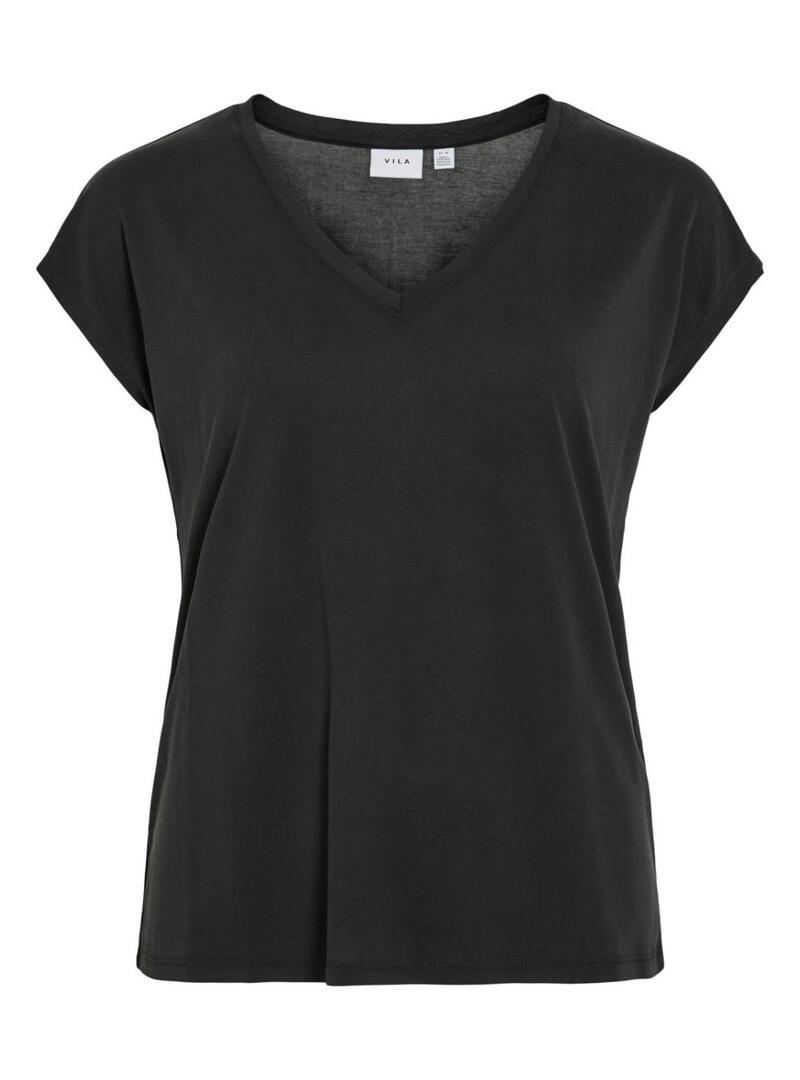 Maglietta Vila. Modello Vimodala. Colore nero. Scollo a V. Manica corta. Tessuto leggero e morbido. Stile basic.