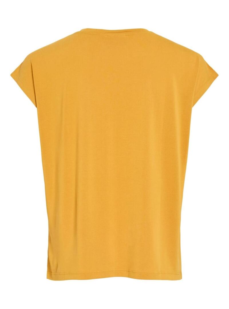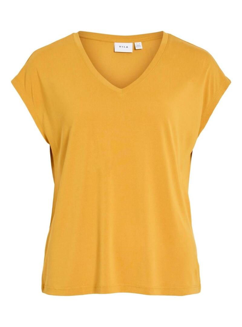 Maglietta Vila. Modello Vimodala. Colore giallo senape. Scollo a V. Manica corta. Tessuto leggero e morbido. Stile basic.