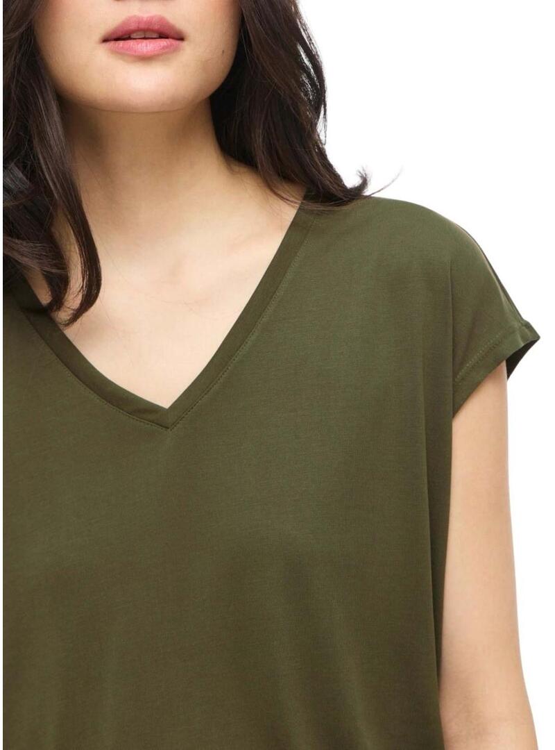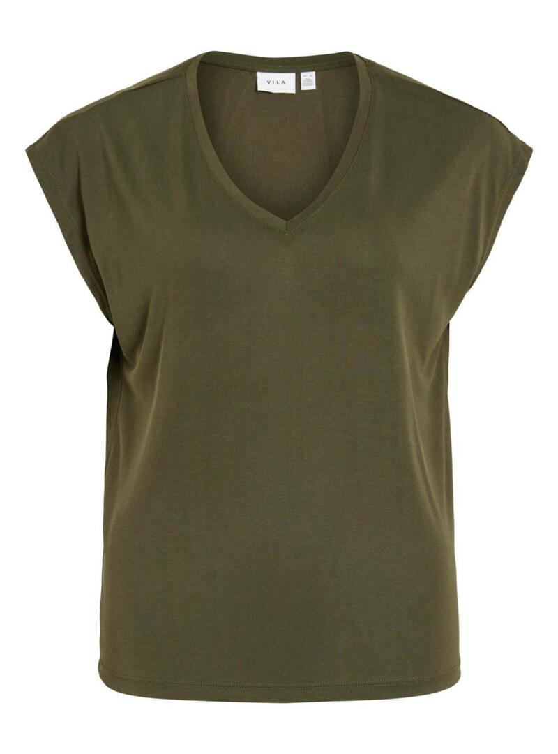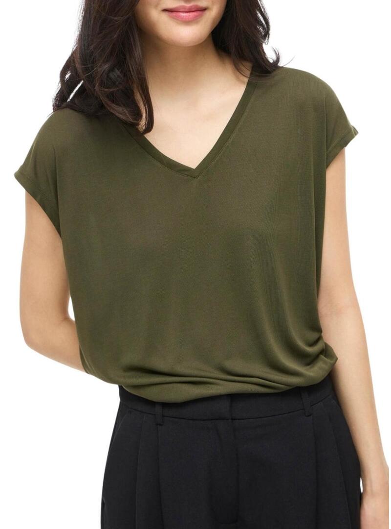 Maglietta Vila. Modello Vimodala. Colore verde. Scollo a V. Manica corta. Tessuto leggero e morbido. Stile basic.