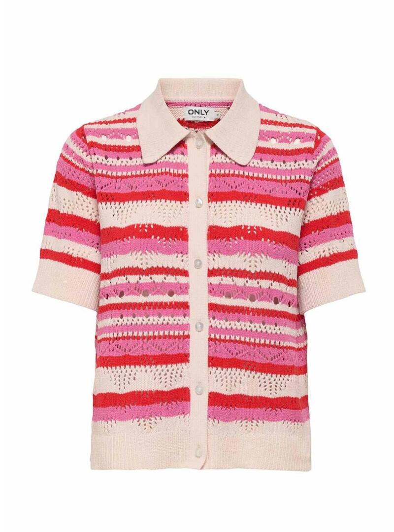 Polo Only. Modello Llula. Colore rosa e beige. Chiusura con bottoni. Colletto da camicia. Manica corta. Vestibilità diritta. Tessuto a maglia traforata. Motivo a righe orizzontali in diverse tonalità di rosa.