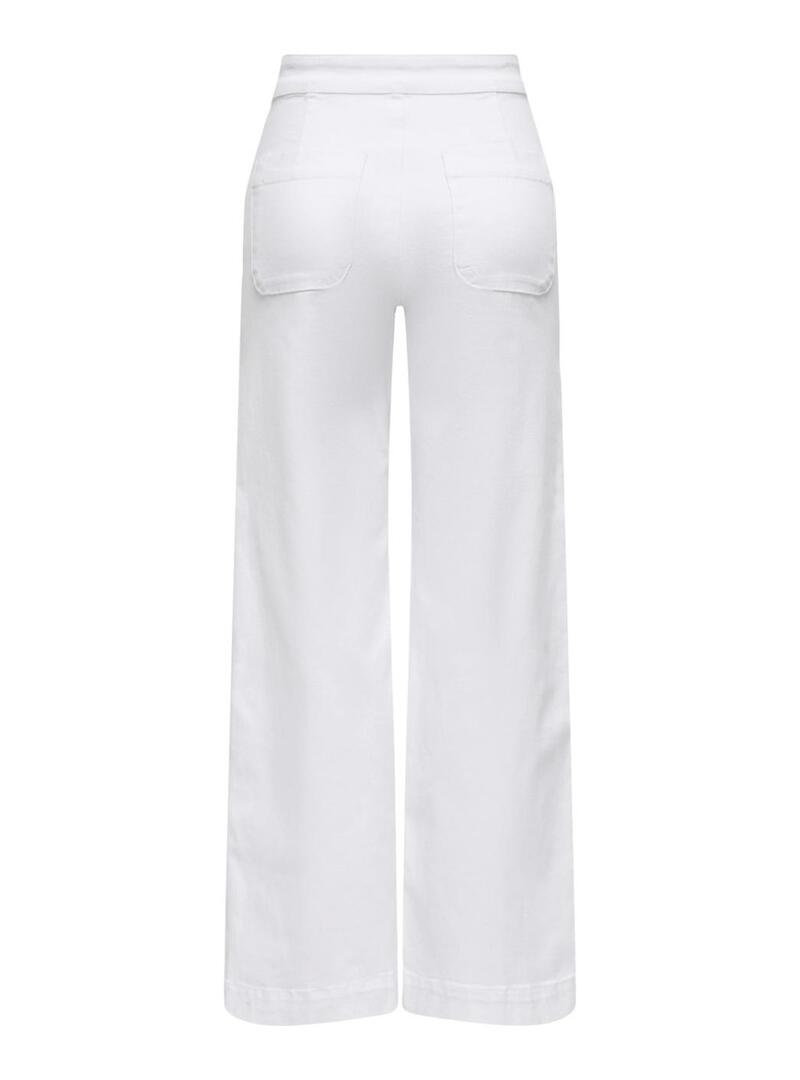 Jeans Only. Modello Madison. Colore bianco. Vita alta. Gamba larga. Tasche posteriori. Tessuto elasticizzato. Chiusura con bottoni laterali su entrambi i lati dei fianchi.