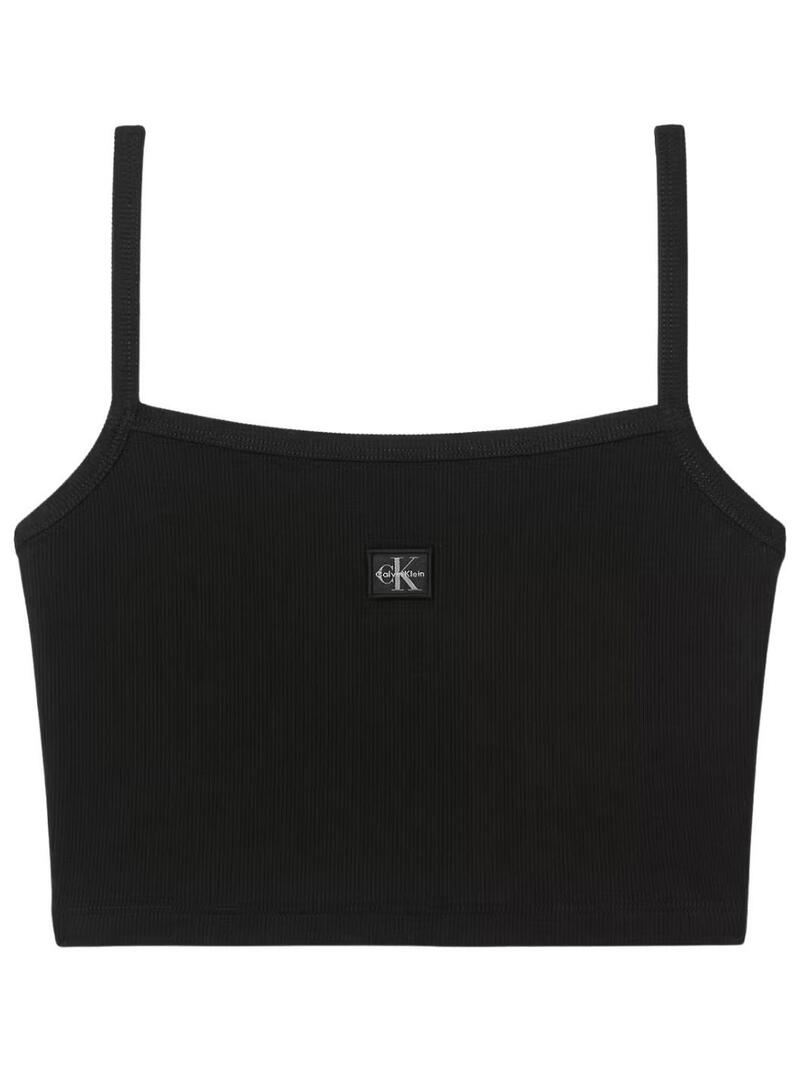 Top corto Calvin Klein Jeans. Modello Baby Crop. Colore nero. Scollatura quadrata. Spalline sottili. Etichetta del marchio ricamata sul petto. Lunghezza crop. Tessuto a coste. Taglio aderente.