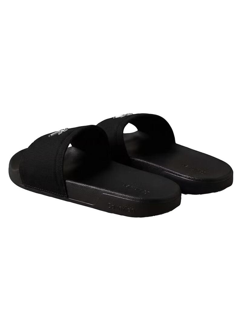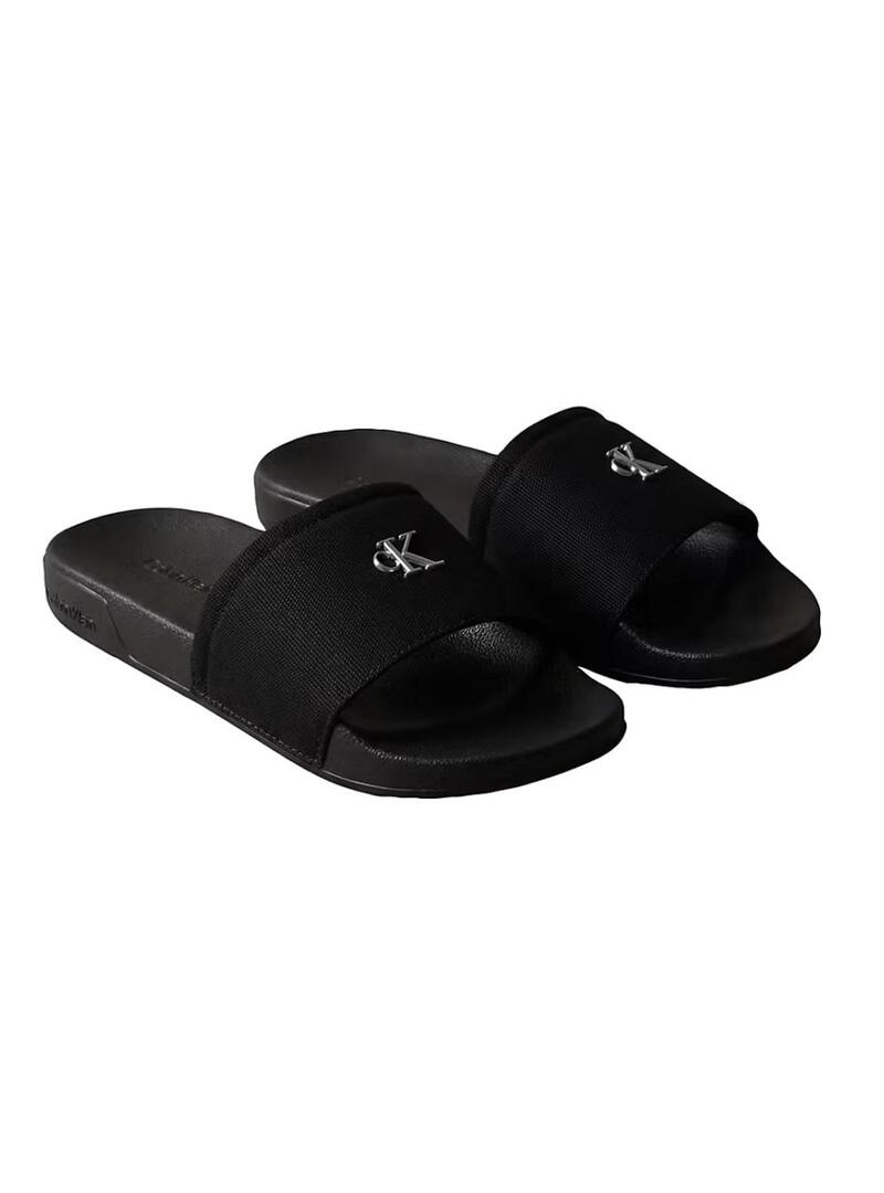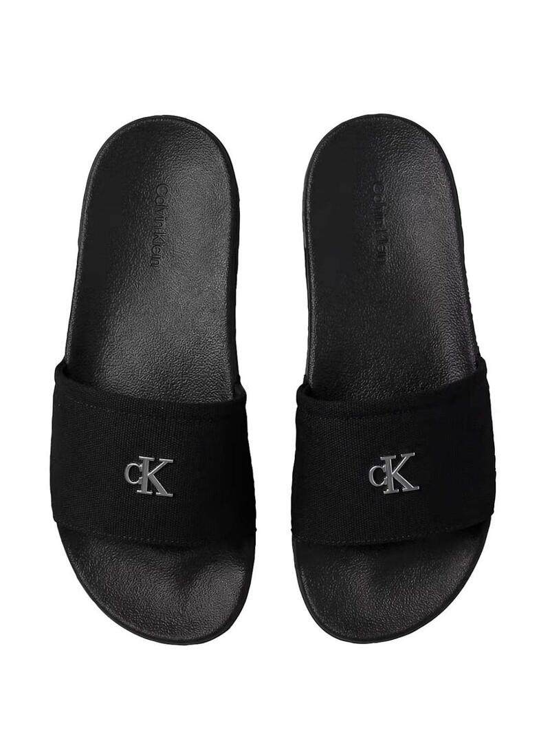 Sandali Calvin Klein Jeans. Modello Slide Canvas. Tomaia in lona di cotone imbottita. Logo metallico in argento. Suola leggera in gomma. Colore nero.