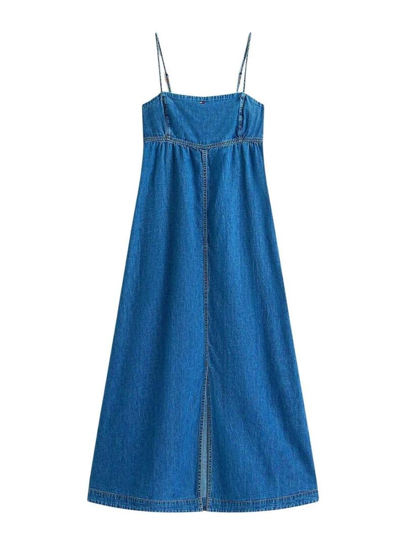 Abito Tommy Jeans. Tessuto Chambray. Scollatura quadrata. Spalline sottili regolabili. Taglio sotto il seno. Girovita arricciato. Logo di Tommy Jeans. Ricamo della bandiera di Tommy nella parte anteriore. Apertura anteriore. Lunghezza massima. Taglio aderente. La modella indossa la taglia S.