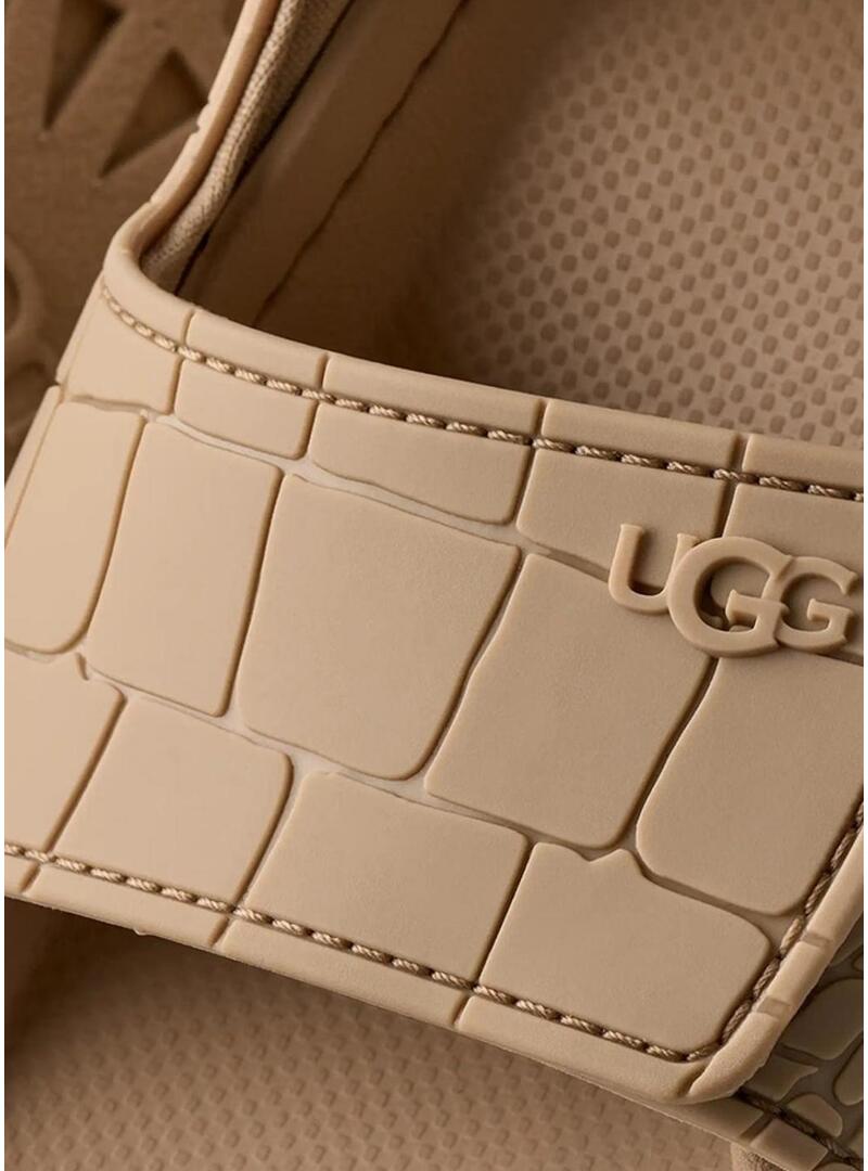 Sandali UGG. Modello GoldenGlow Embossed. Colore tostato. Parte superiore in TPU con rilievo. Presenta una stampa di coccodrillo. Chiusura a strappo. Intersuola e suola in EVA. Tirante posteriore.