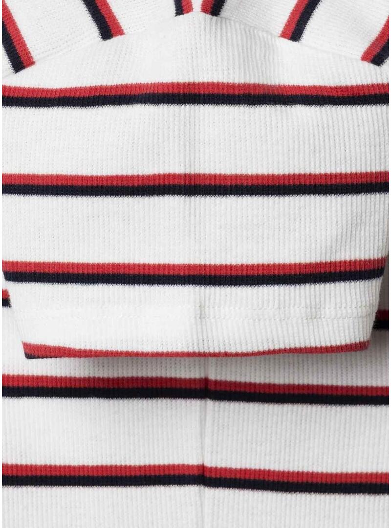 Maglietta Pepe Jeans. Modello Angy. Motivo a righe orizzontali. Tessuto a coste elasticizzato. Collo rotondo. Manica corta. Chiusura frontale con bottoni. Logo ricamato in basso.