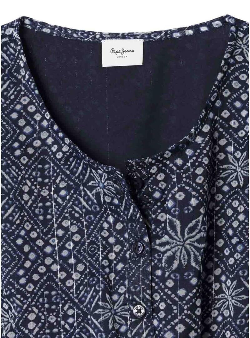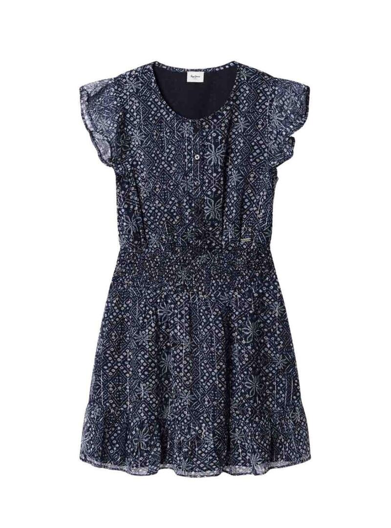 Abito Pepe Jeans. Modello Imabel. Colore blu scuro. Taglio corto. Tessuto leggero di chiffon. Colletto rotondo. Chiusura frontale con bottoni fino alla vita. Manica corta stile farfalla con volant. Vita elastica con pannello a nido d'ape. Stampa floreale all over. Volant sul fondo. Interno foderato. Targhetta metallica con logo.