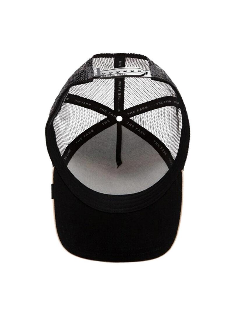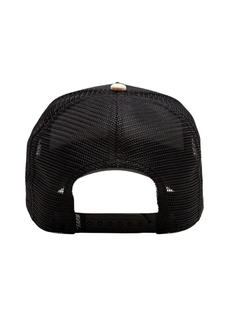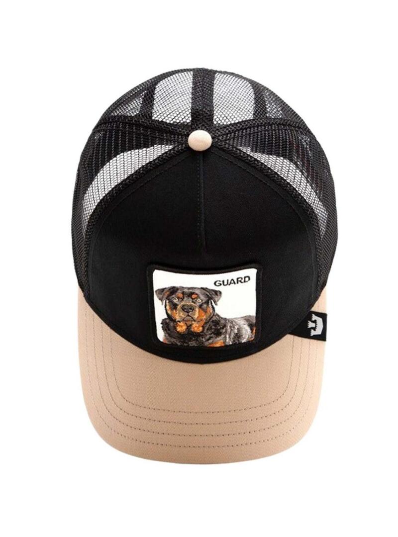 Cappello Goorin Bros. Modello The Guard Dog. Colore nero. Visiera color beige. Illustrazione di un Rotweiler stampata sul davanti. Parte posteriore in rete. Cinturino posteriore regolabile.