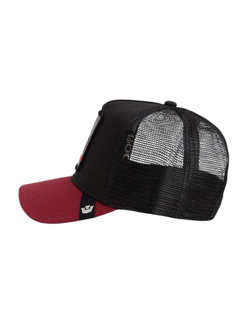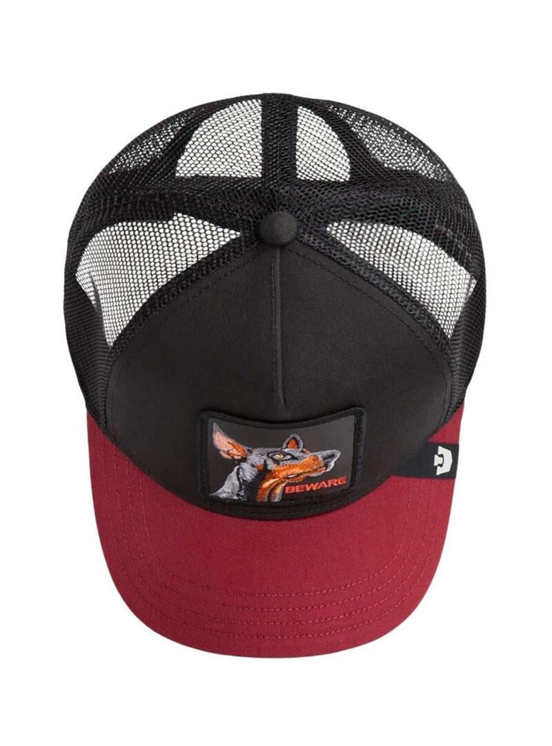 Cappello Goorin Bros. Modello Beware. Colore nero e rosso. Illustrazione di Doberman ricamata sul davanti. Parte posteriore in rete. Cinturino posteriore regolabile. Visiera a contrasto.