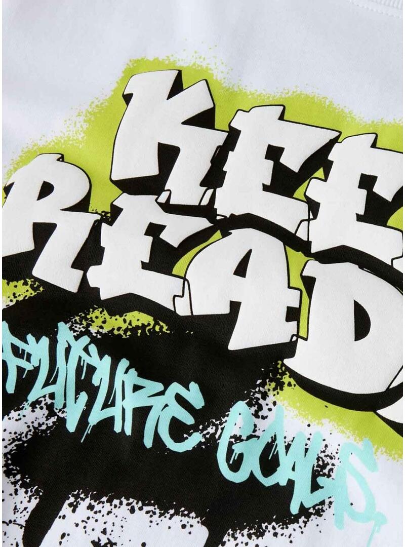 Maglietta Name It. Modello Flynn. Colore bianco. Collo rotondo a coste. Manica corta. Taglio regolare. Serigrafia stile graffiti sul petto e sulla schiena.