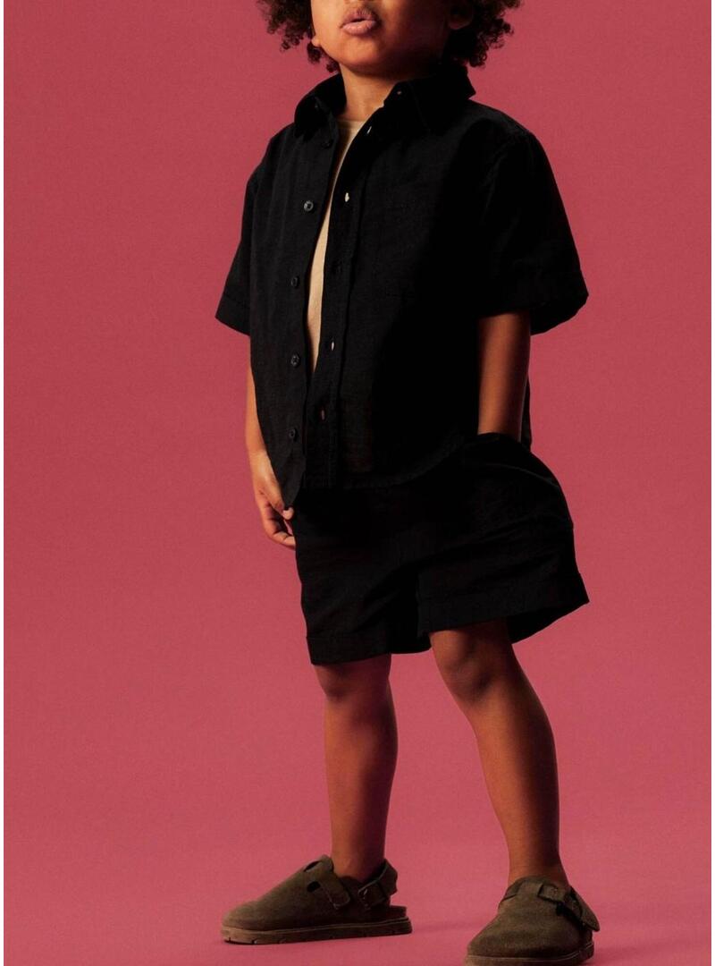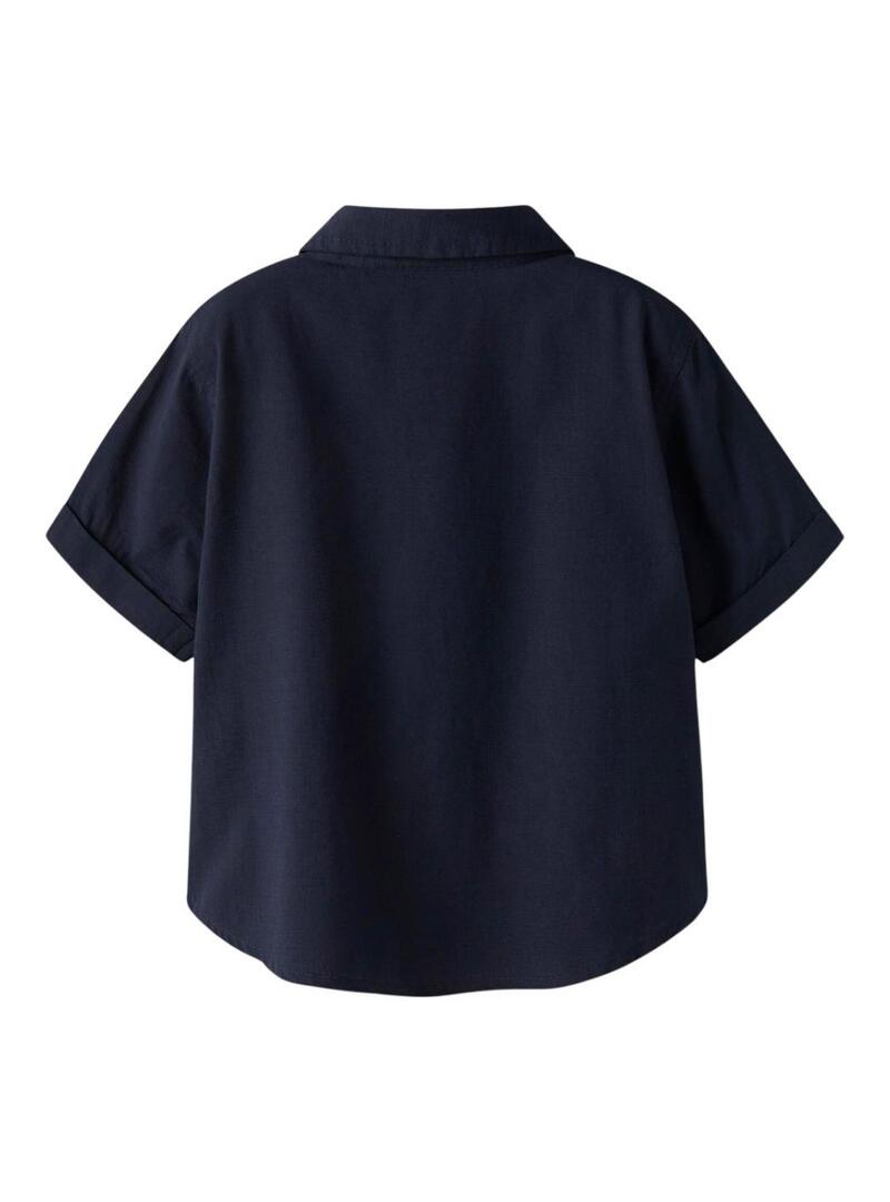 Camicia Name It. Modello Filip. Colore blu scuro. Chiusura frontale con bottoni. Colletto da camicia. Manica corta. Tasca sul petto. Taglio regular fit.