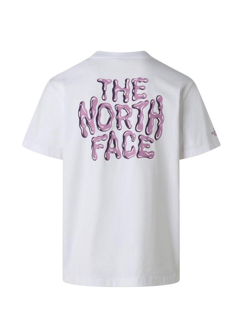 Maglietta The North Face. Modello Drip Logo. Colore bianco. Logo stampato sul petto e sulla schiena con effetto slime. Dettagli rosa. Manica corta. Leggermente largo.