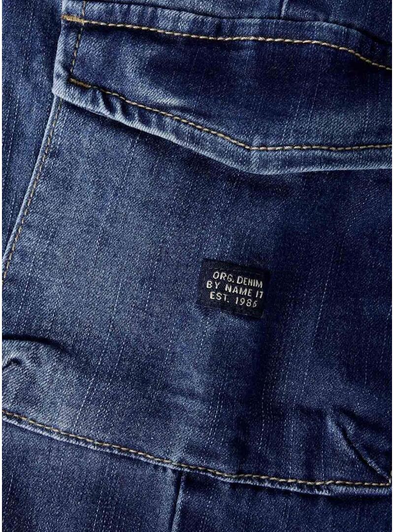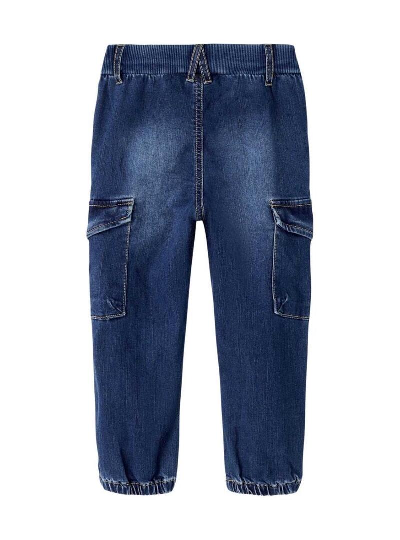 Pantaloni in denim Name It. Modello Ben. Colore blu scuro. Taglio baggy. Vita regolabile con coulisse. Tessuto a costine in vita. Due tasche laterali. Due tasche cargo sulla gamba. Polsini elastici. Passanti per cintura.