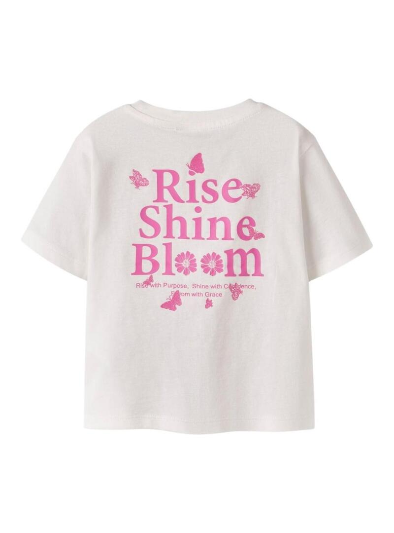 Maglietta Name It. Modello Futia. Colore bianco. Girocollo. Manica corta. Stampa sul petto e sulla schiena. Taglio regolare.