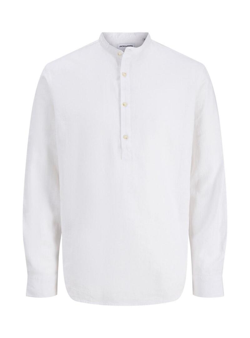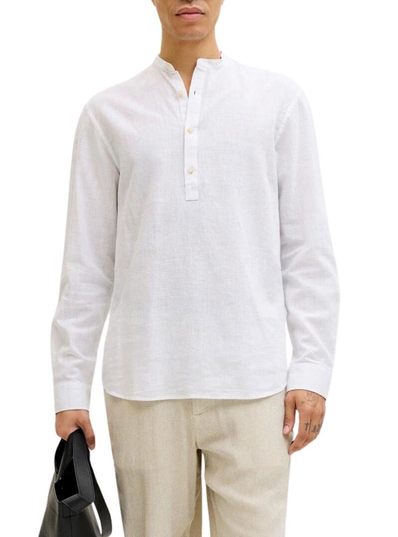 Camicia Jack and Jones. Modello Summer. Colore bianco. Colletto mao. Chiusura frontale con bottoni a metà corpo. Manica lunga. Tessuto leggero in lino. Vestibilità regolare. Stile polo.