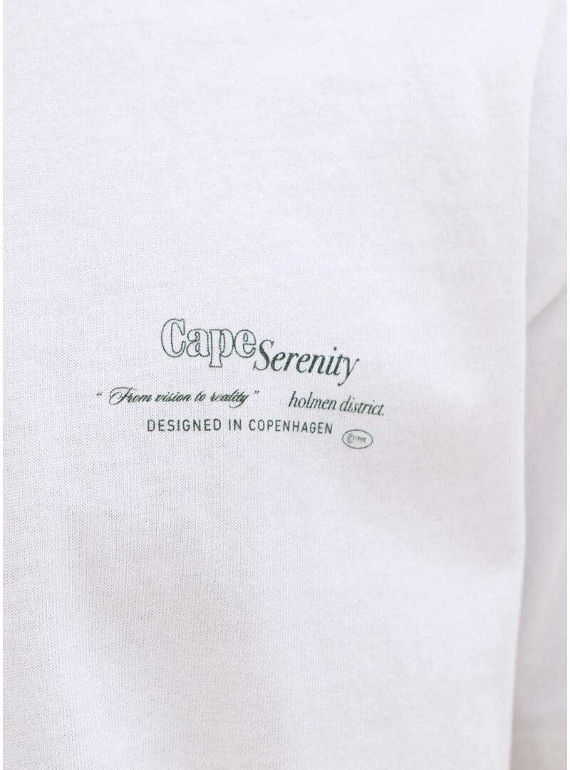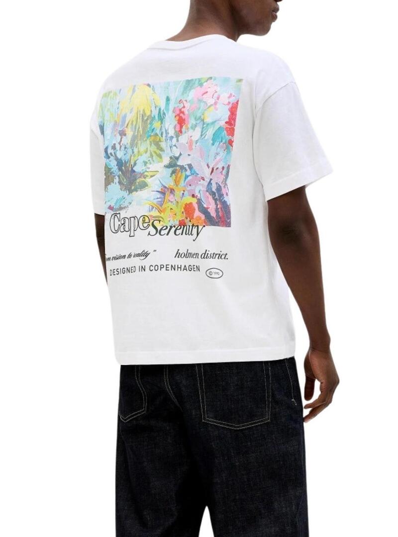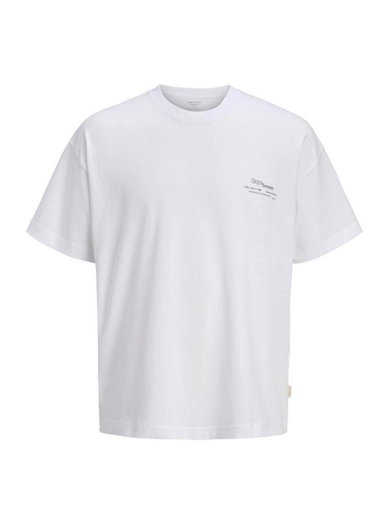 Maglietta Jack and Jones. Modello Montauk. Colore bianco. Collo rotondo. Manica corta. Vestibilità larga. Illustrazione stampata sulla schiena. Messaggio stampato sul petto.